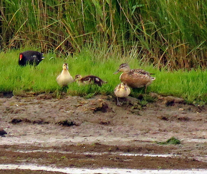 Gadwall with 3 of 4 young in view – Lytchett Fields – Ian Ballam