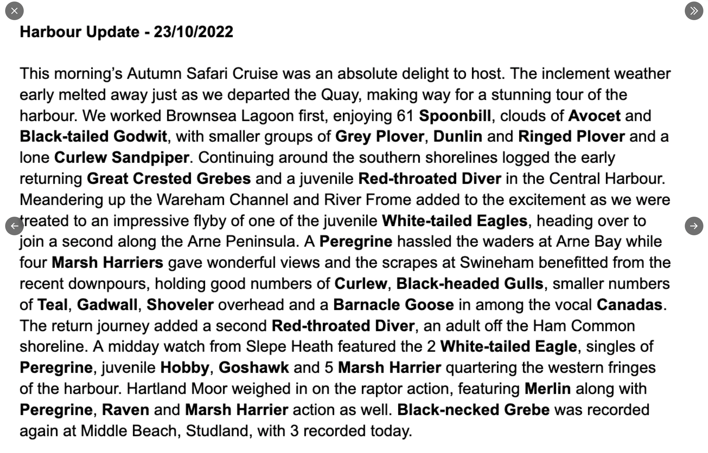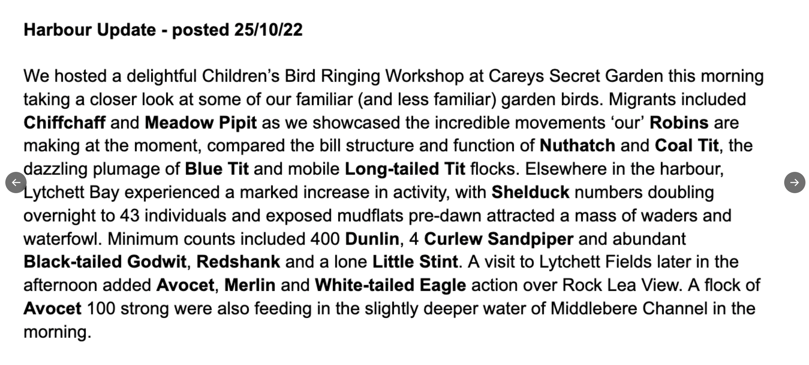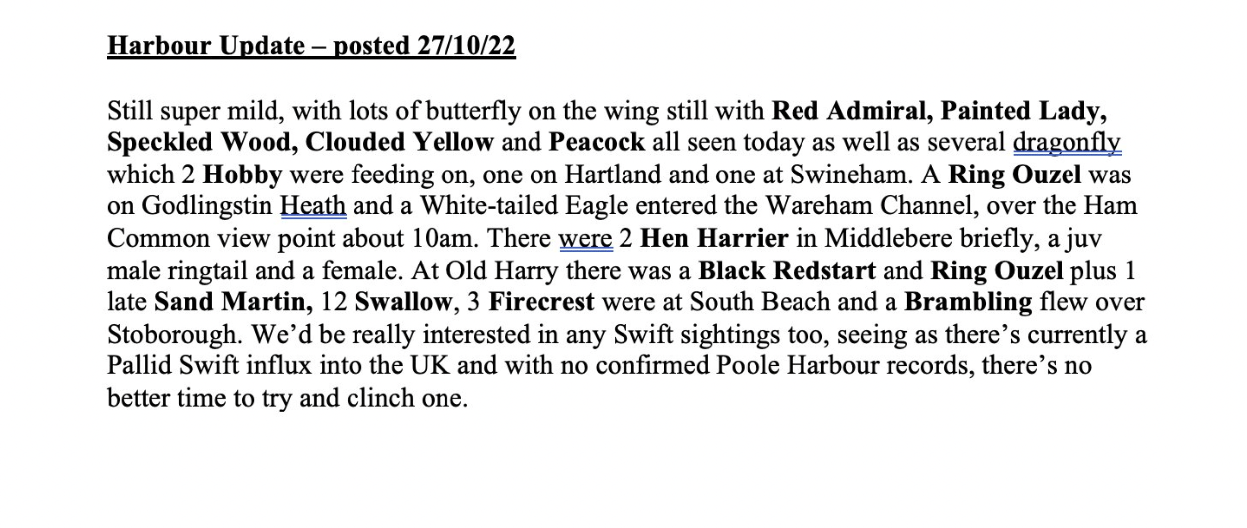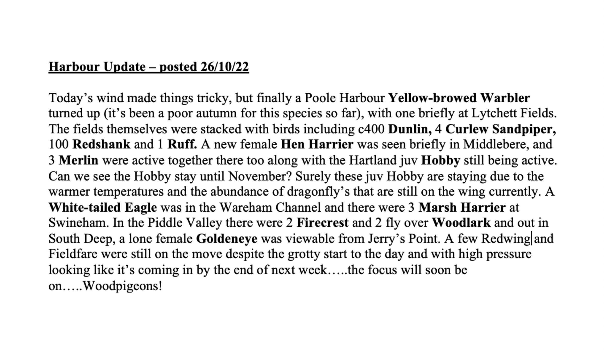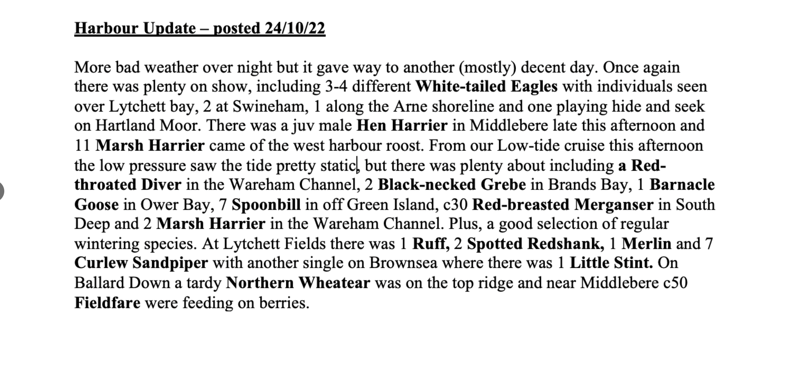Elsewhere around the harbour there was the welcome sight of 2 White-tailed Eagles again in the Wareham Channel, having been absent for several days. At Lytchett Bay, the Yellow-browed Warbler was calling again next to the new Rock Lea viewpoint and 2 Marsh Harrier were seen from there too. At South beach and Middle Beach an excellent count of 12 Firecrest and 17 Chiffchaff, but sadly not the hoped for Pallas’s or Yellow-browed. Also 2 Brambling over there too. In Holes Bay Wigeon numbers hit 1138 with a Spotted Redshank in the Holes Bay NE sector. There was also a Spotted Redshank in Brands Bay and still 2 Curlew Sandpiper at Lytchett Fields. A ringtail Hen Harrier was seen in the Middlebere Channel and on Friday an adult male Hen Harrier was photographed at Swineham. Other bits and pieces included a Common Sandpiper at Holes Bay NE, 2 Common Scoter and 2 Black-necked Grebe off Middle Beach with 3 Ring-necked Parakeets in the trees at South Beach. Merlin were logged at Greenlands Farm, Hartland and Middlebere, 36 Spoonbill were on Brownsea, a Red Kite was over Arne and a flock of 50 Fieldfare were near Corfe Castle in the Corfe River Valley.