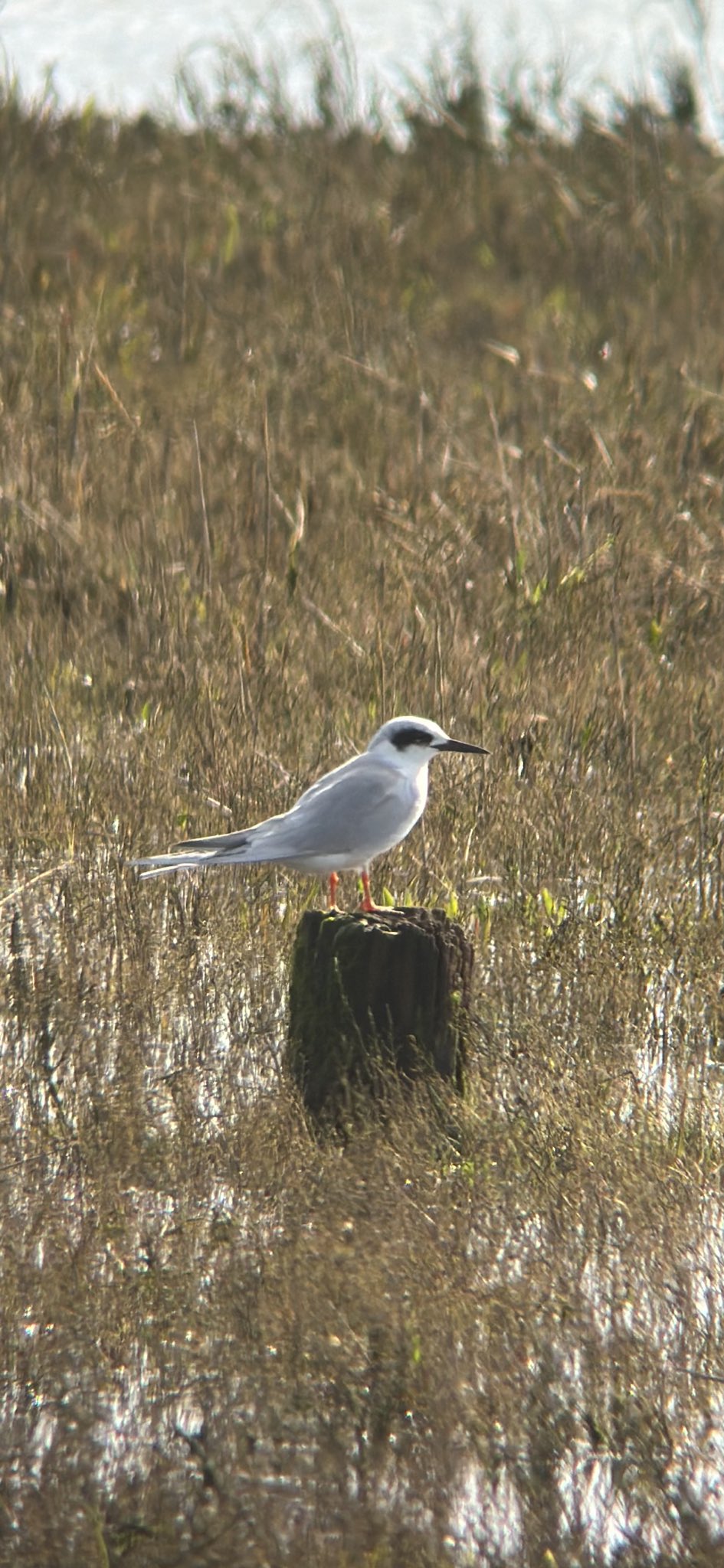 Finaly some Spring-like weather today in the harbour, with the birds certainly responding, and you never know what’s going to turn up at this time of year! The Forster’s Tern is back! Having wintered over in Brittany, France we think, it was spotted this morning off Shipstal Point on it’s favourite post next to the beach. It’s still in it’s winter plumage making identification a little easier with the characteristic eye mask. However, if it stays in the harbour long enough and moults into it’s breeding plumage, it will be nearly impossible to tell apart from the Common Terns.