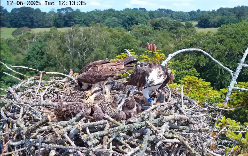 It’s been an exciting week for Ospreys all-round! The Carey Osprey chicks are doing incredibly well and CJ7 and 022 have been on raptor watch as the warm weather means Buzzard and Red Kite have been particularly active, soaring on the thermals nearby. The four chicks now have nearly all their juvenile feathers through and are starting to look like their parents! 022 has been bringing in several fish a day, mostly sizeable bass which there are lots of in the harbour at this time of year. At this nest Bass seems to play an important role in their diet in the nestling stage. Chick number 1 is now just over 4 weeks old, almost fully grown!