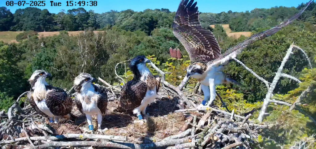 On Thursday, despite the heat, morning drizzle and high winds meant conditions for hunting weren’t favourable, with 022 not returning to the nest with food until the early afternoon on several days. Ospreys hunt for top-feeding fish, those that swim close to the surface. Poor weather conditions can disrupt the surface of the water and make prey difficult to see for our ospreys. With the chicks growing rapidly, space is becoming limited in the nest. CJ7 is now spending more time out of the nest, sat on perches at the edge of the nest or on top of the webcam. With a few weeks to go until fledging, and the chicks now testing their wings, it’s only going to get more cramped.