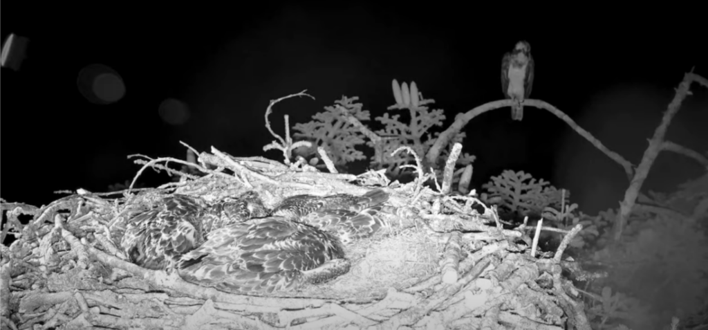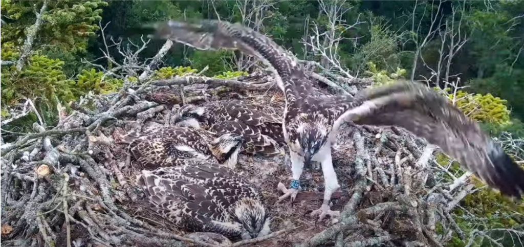 Now that 022 and CJ7 have hatched their four chicks, they are on high alert for any threats from predators. On Saturday, the last day of spring, one of Poole Harbour’s adult white-tailed eagles flew over the nest. This also happened during incubation, when CJ7 hunkered down over the eggs and kept an osprey eye out as it soared overhead. Today, 022 soared into the sky and made sure to see the white-tailed eagle on its way!