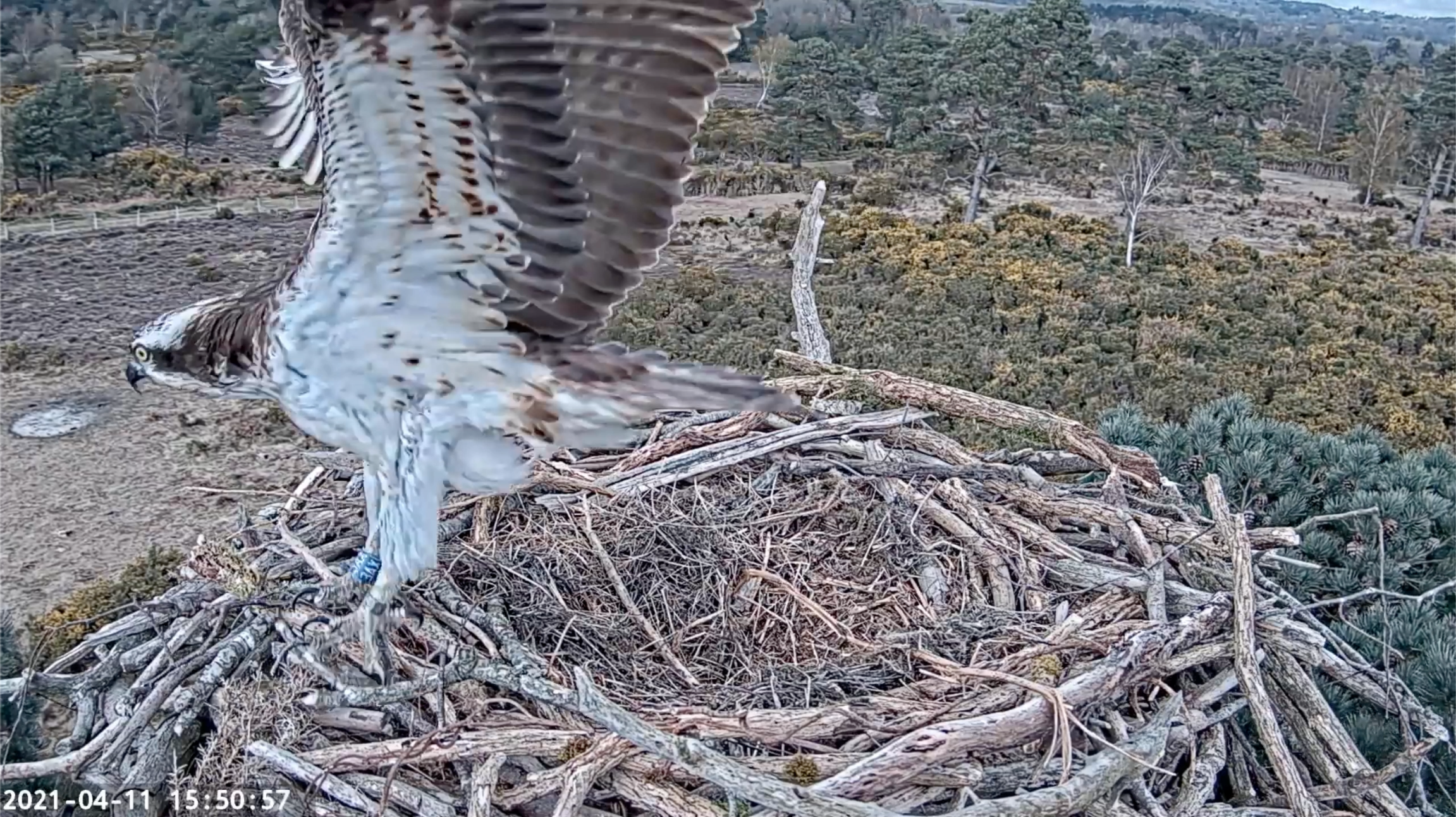 It looks like the long-staying Middlebere female has finally departed, with no sightings since midday yesterday. Meanwhile, CJ7 and 022 are starting to look very settled on the new livestream nest. We don’t think CJ7 has left the nest site since 022 arrived six days ago on Sunday 10th April, as he has been provisioning for her and himself ever since he arrived back, and is doing an excellent job! This behaviour bodes very well for the season ahead, as should they breed he will be responsible for feeding the whole family, catching at least 4 or 5 fish each day.