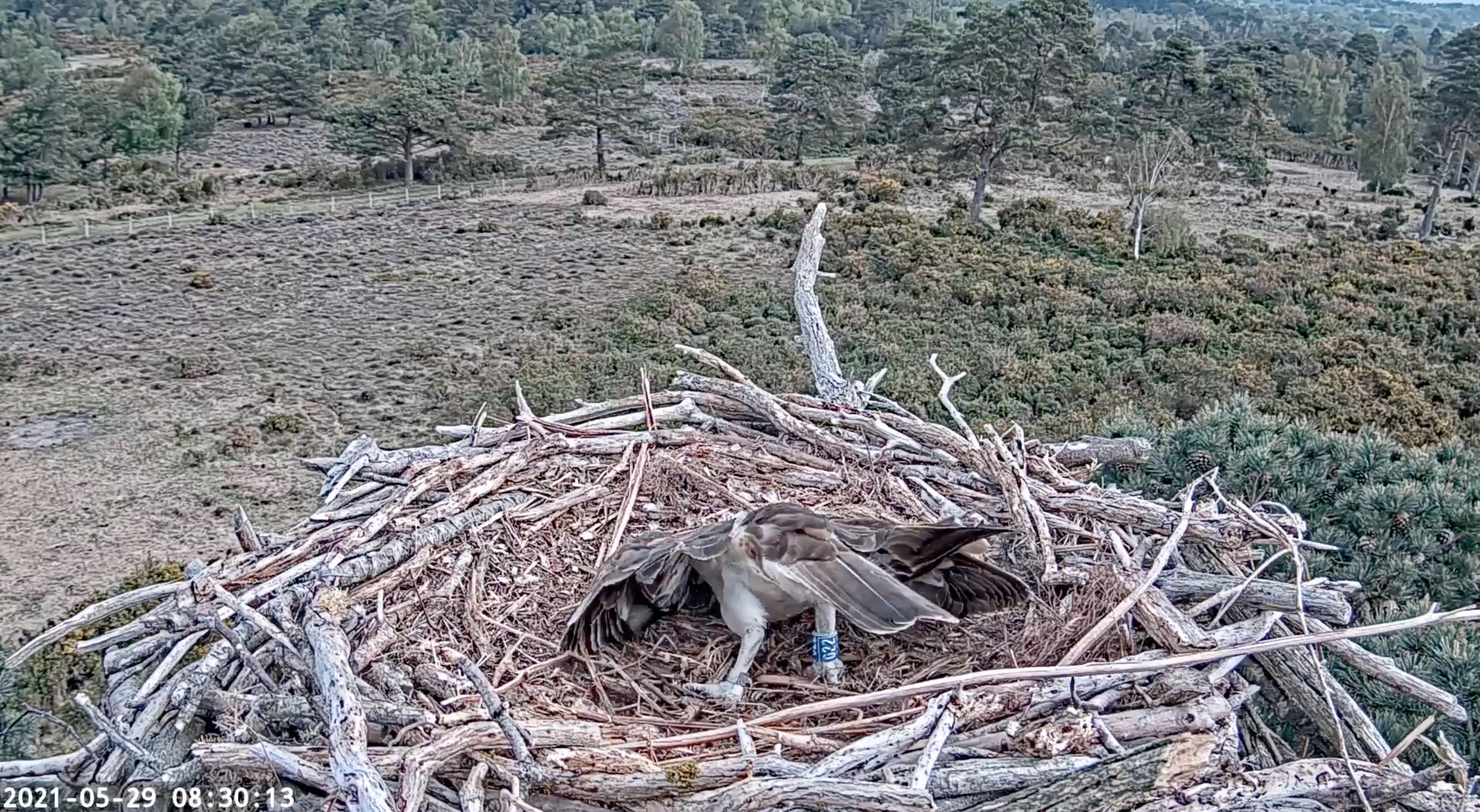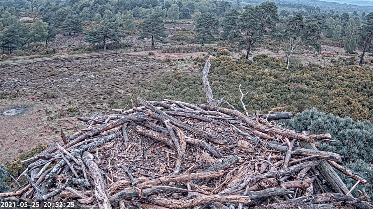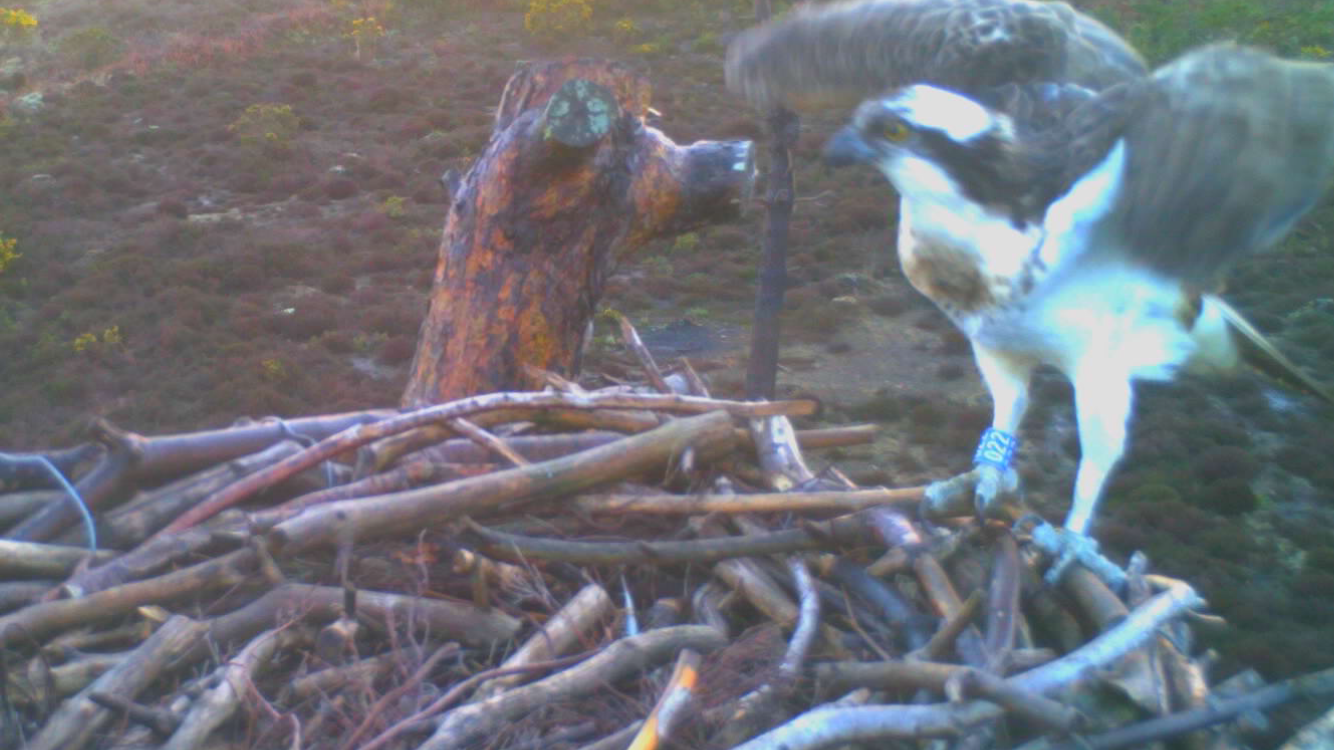 An early start for the pair today, with 022 appearing at the camera at around 5:30am, being replaced by CJ7 shortly after. 022 caught and made a fish delivery to CJ7 at 7:05am, which she then took away to eat off camera. We’ve seen some nest shaping activity again today and the pair have been on and off the nest throughout the day. 022 was seen over the Middlebere channel this morning, and it seems that there is at least 1 or 2 unringed birds still in the area.