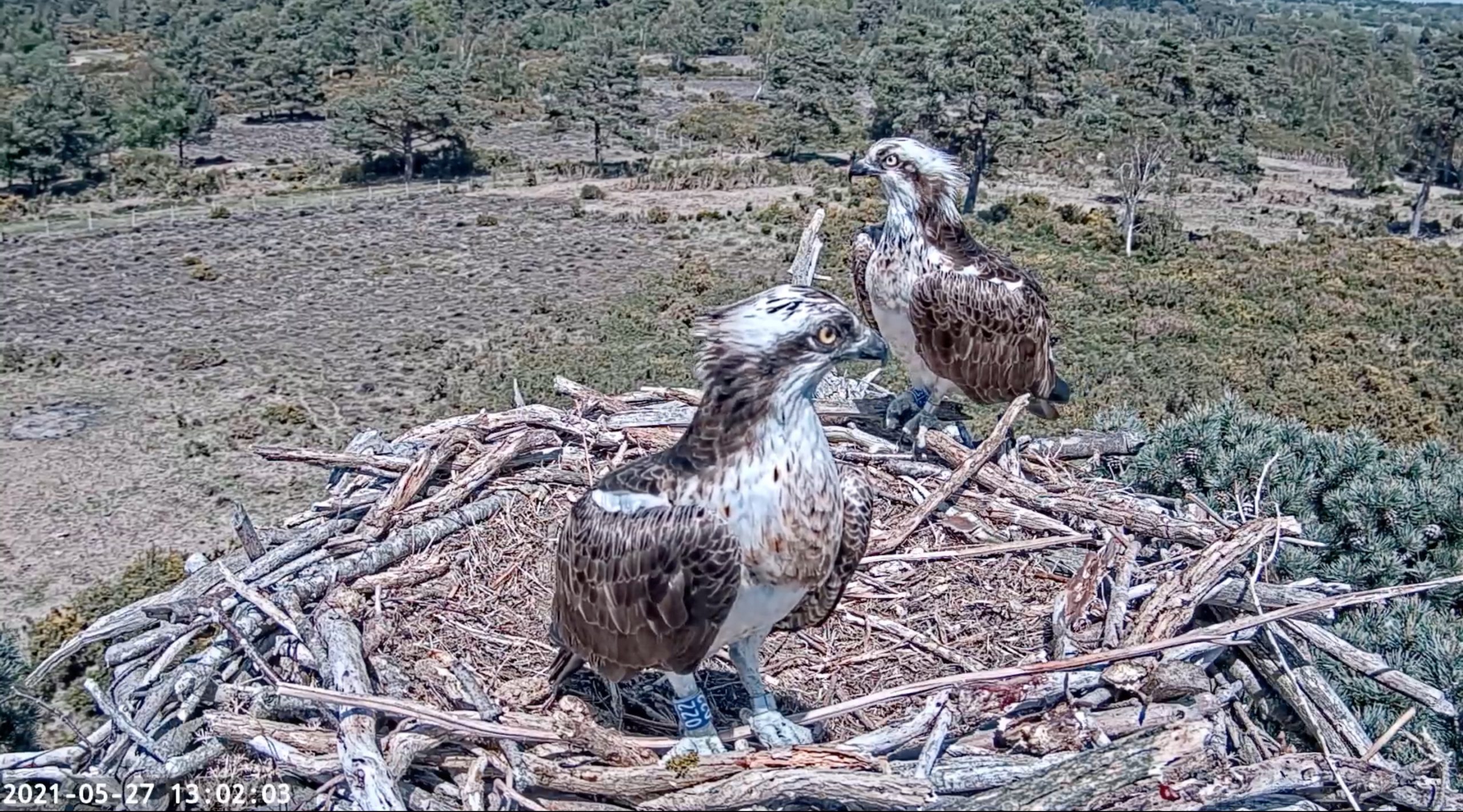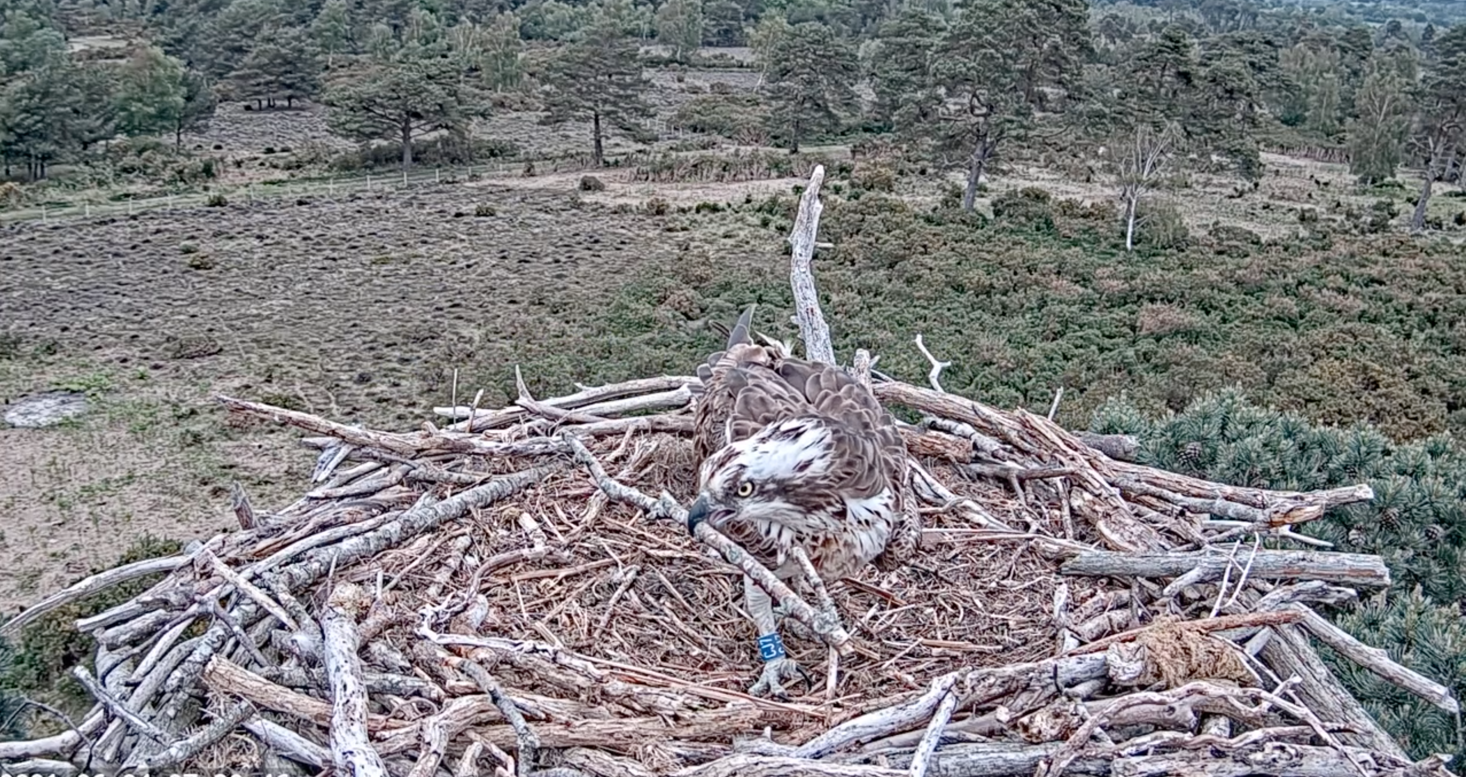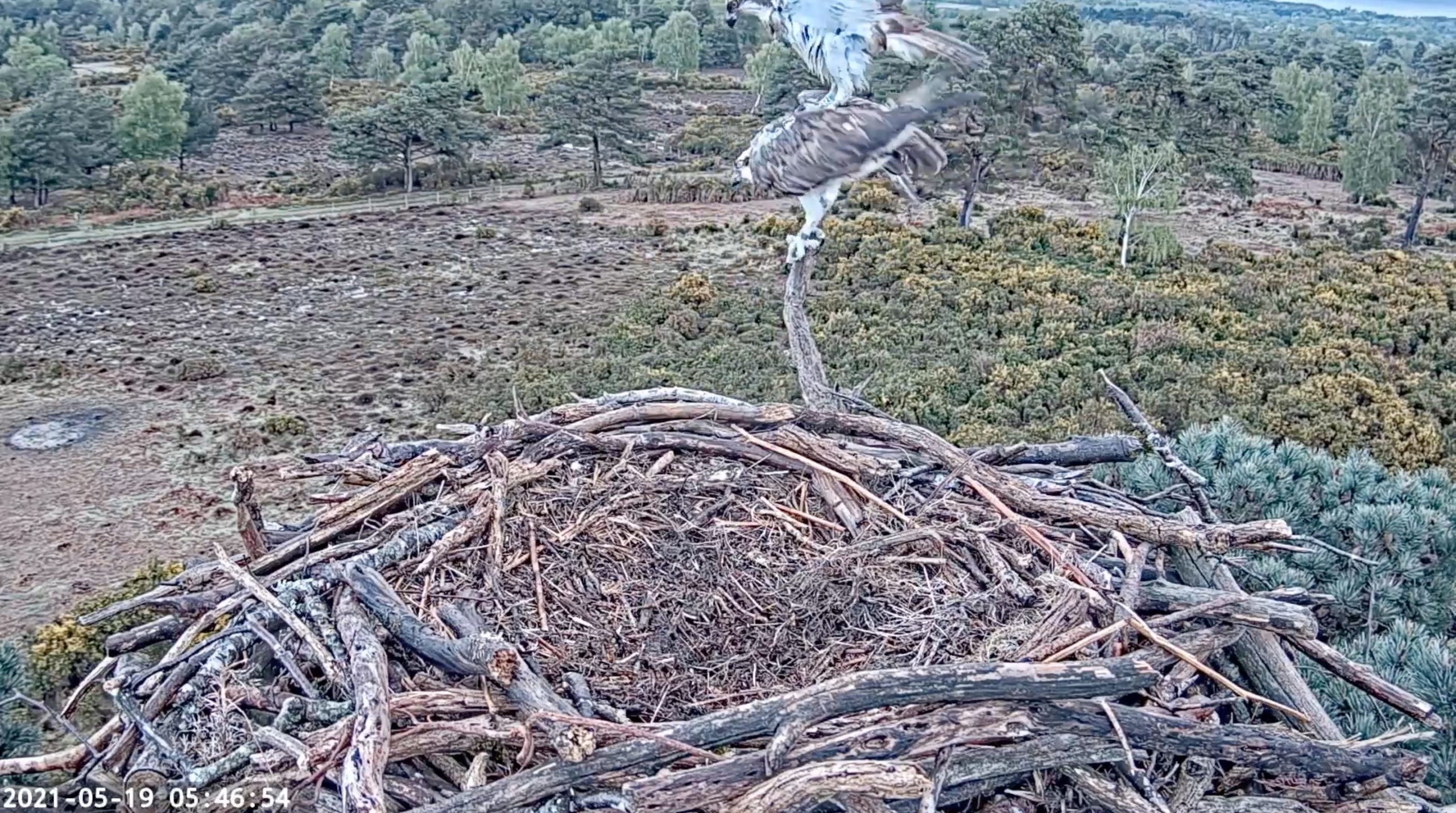 An early start for the pair today, with 022 appearing at the camera at around 5:30am, being replaced by CJ7 shortly after. 022 caught and made a fish delivery to CJ7 at 7:05am, which she then took away to eat off camera. We’ve seen some nest shaping activity again today and the pair have been on and off the nest throughout the day. 022 was seen over the Middlebere channel this morning, and it seems that there is at least 1 or 2 unringed birds still in the area.