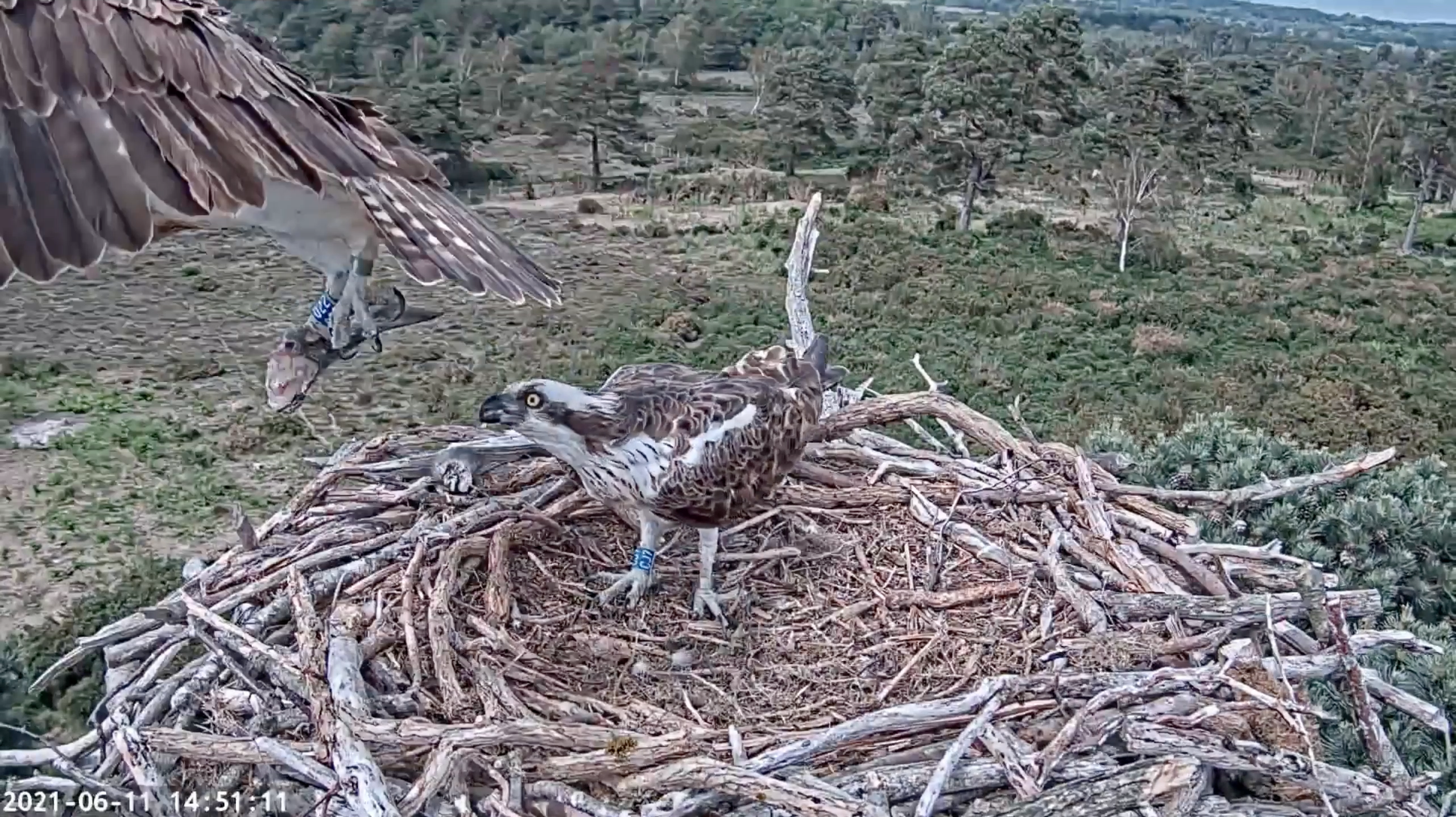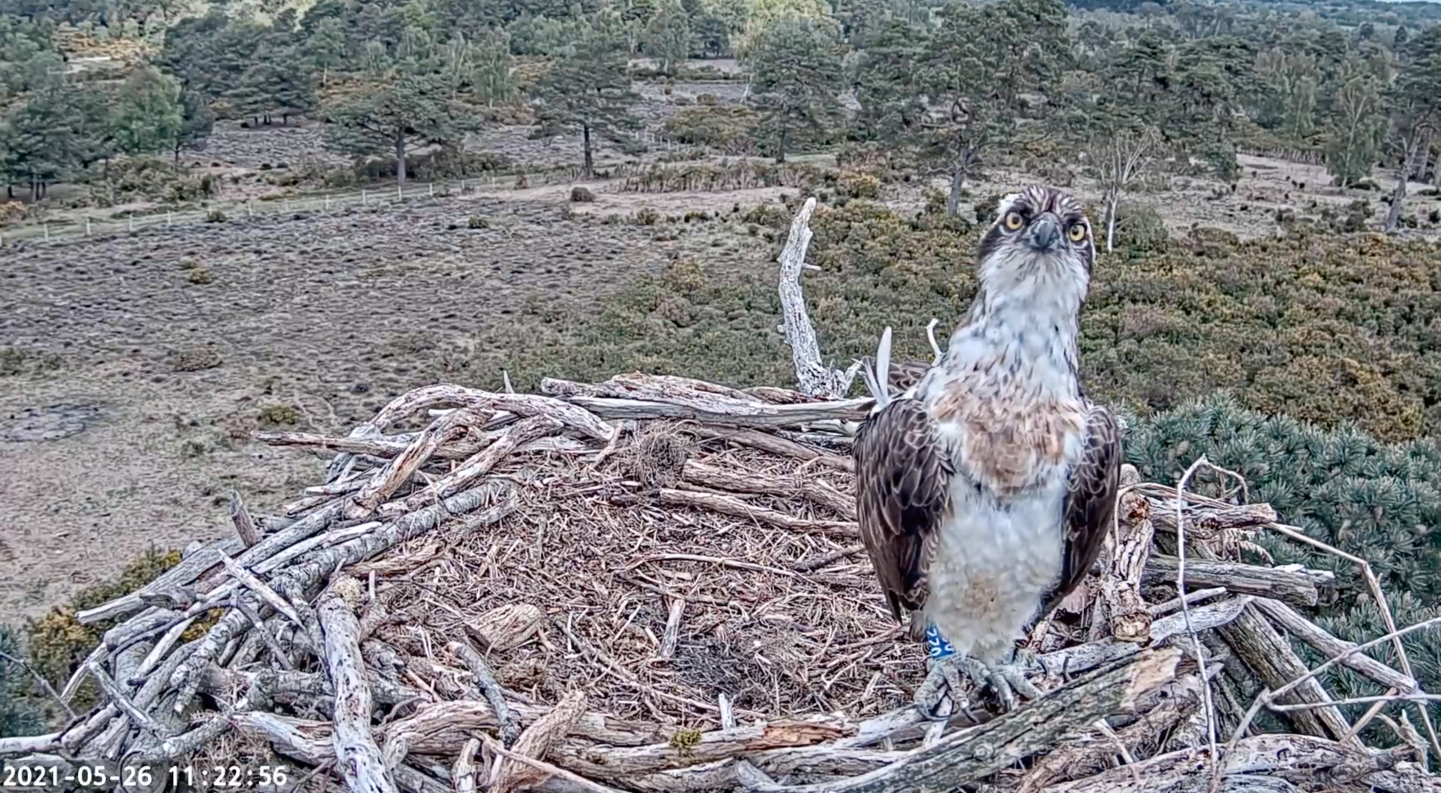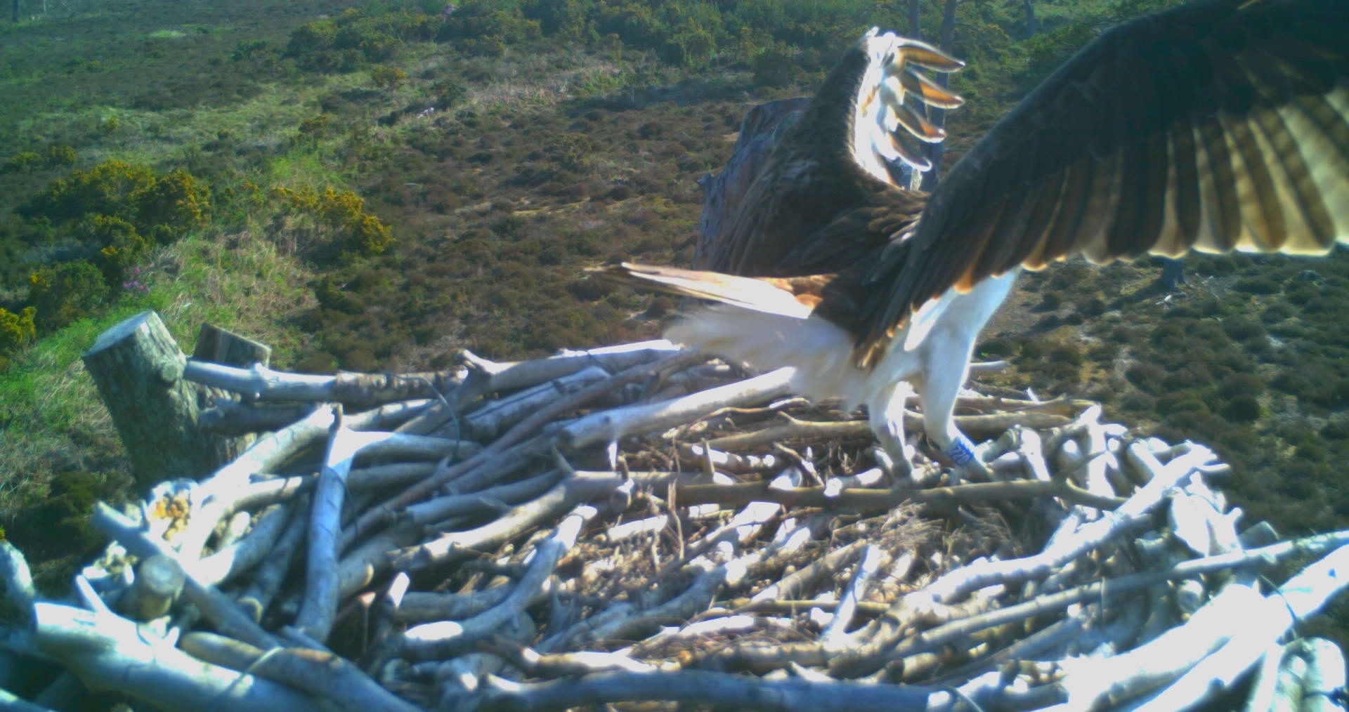 The big news today is that our young translocated female 019 has been spotted back in the country for the first time this year! She’s back in North Wales for her second summer, and making her presence known. She touched down on the Llyn Brenig nest just after half past 12, landing alongside their breeding male, LJ2. Interestingly this is a male which 014 (another of our translocated females now breeding in Wales) was seen with at the Dyfi nest in 2020. After this brief encounter 019 was quickly chased out of the vicinity by the pair, but will no doubt return to this and other nests as the season progresses. It’s wonderful to see her back for the second time and looking for nesting opportunities. Fingers crossed she find’s a male to pair up with in the coming months!