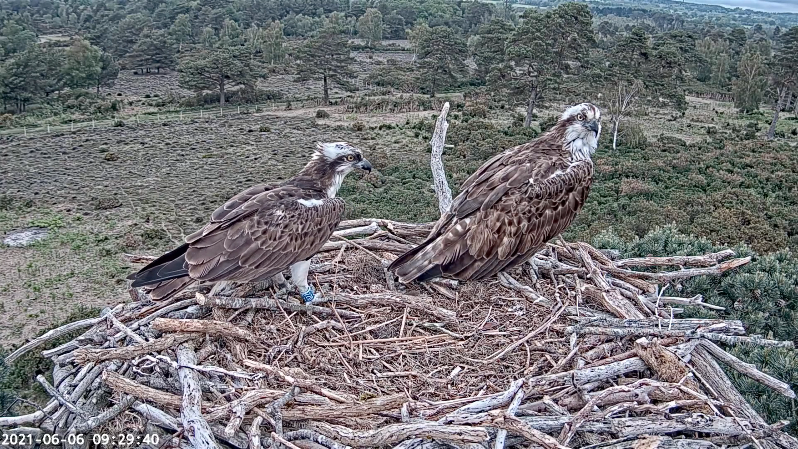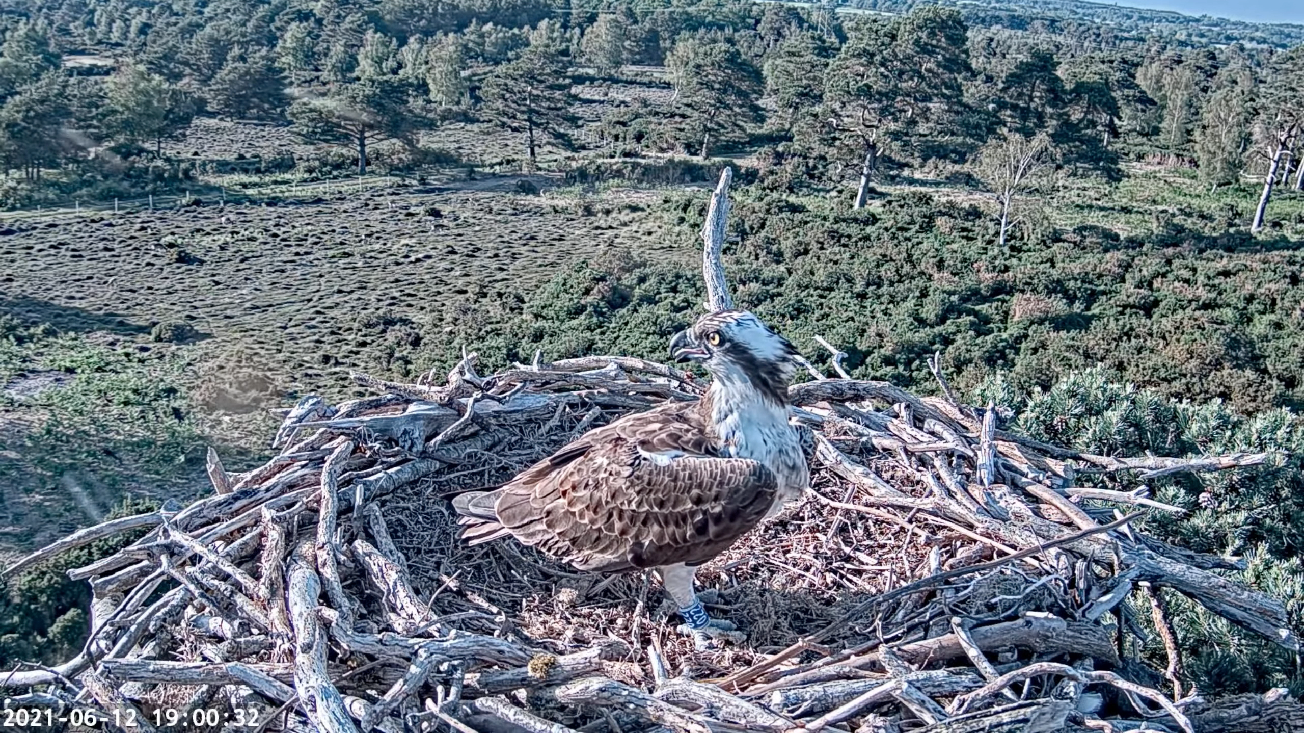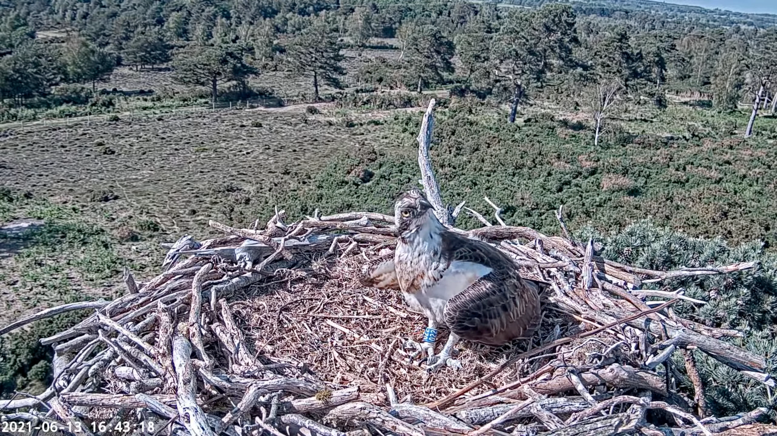 The big news today is that our young translocated female 019 has been spotted back in the country for the first time this year! She’s back in North Wales for her second summer, and making her presence known. She touched down on the Llyn Brenig nest just after half past 12, landing alongside their breeding male, LJ2. Interestingly this is a male which 014 (another of our translocated females now breeding in Wales) was seen with at the Dyfi nest in 2020. After this brief encounter 019 was quickly chased out of the vicinity by the pair, but will no doubt return to this and other nests as the season progresses. It’s wonderful to see her back for the second time and looking for nesting opportunities. Fingers crossed she find’s a male to pair up with in the coming months!