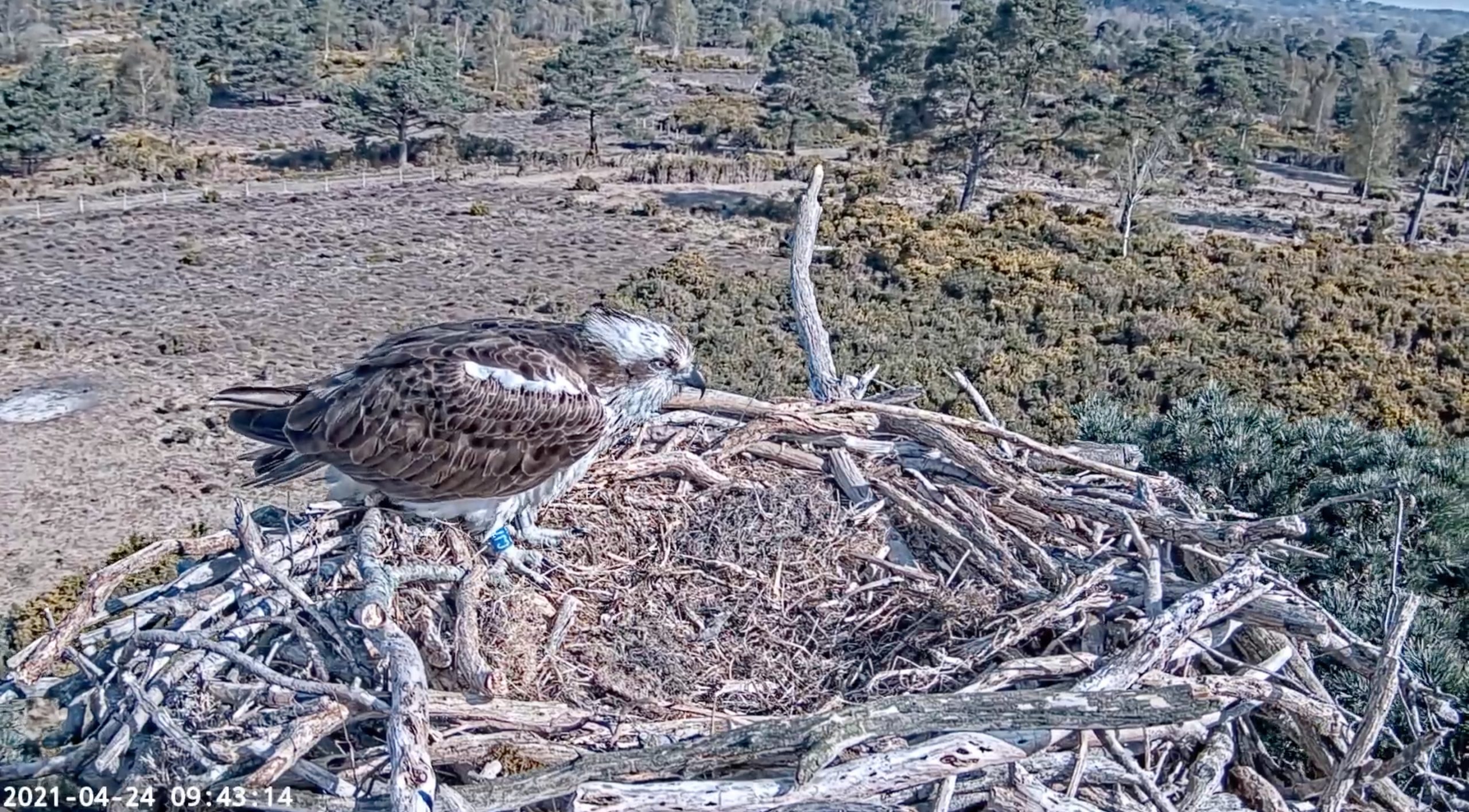 Some very interesting behaviour from CJ7 today, she seems to be spending a lot of time stood in the nest looking down into the bowl and moving small pieces of nest lining around… could she be preparing to lay?! She certainly hasn’t strayed far from the nest at all in the last few days. She also seems to be refusing mating attempts from 022, perhaps indicating that egg development is already underway. We’ll be keeping a very close eye on her in the next few days, to see if she continues preparing the egg cup or starts laying in the nest. A female osprey, presumably the one seen intruding yesterday, was seen this afternoon from Hyde’s Heath at Arne circling out over the Wareham Channel. It will be interesting to see whether her encounter with our pair encourages her to stick around.