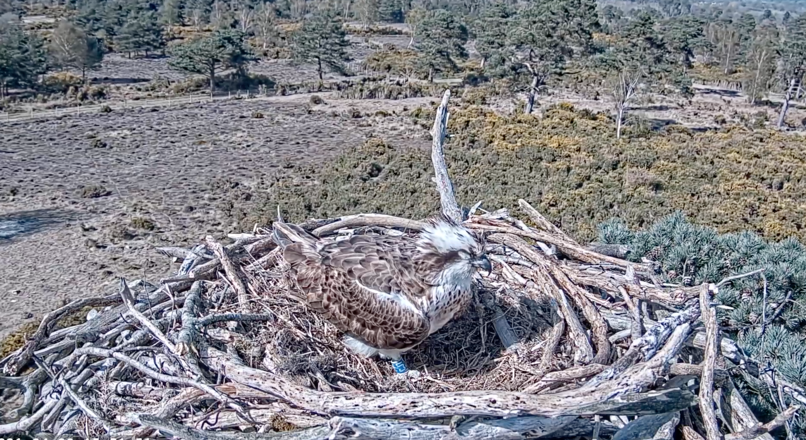 Just a few brief appearances made by CJ7 today, appearing shortly after 6am on one of the nest platforms she’s previously visited this year already, but left by 7am. Interestingly, she made her first appearance on the Middlebere nest platform this morning at 9:20am, leaving before an unringed Osprey landed on Middlebere nest with a fish. With more activity in this area today, the best place to view the Middlebere nest platform is from Coombe Heath at RSPB Arne. With the high winds today, conditions haven’t been ideal, so we expect that CJ7 has been largely inactive – hopefully we will see more of her tomorrow!