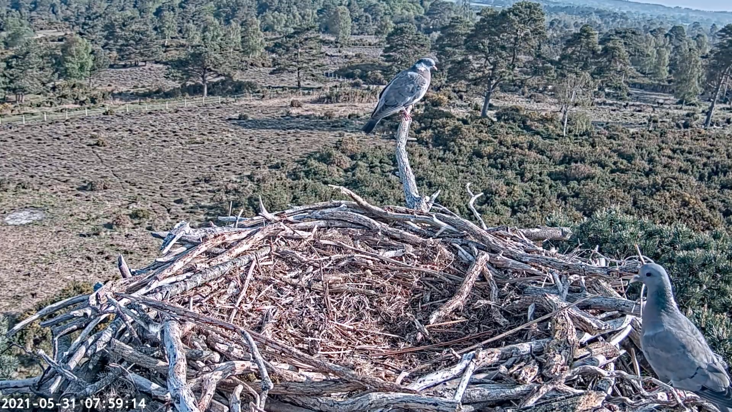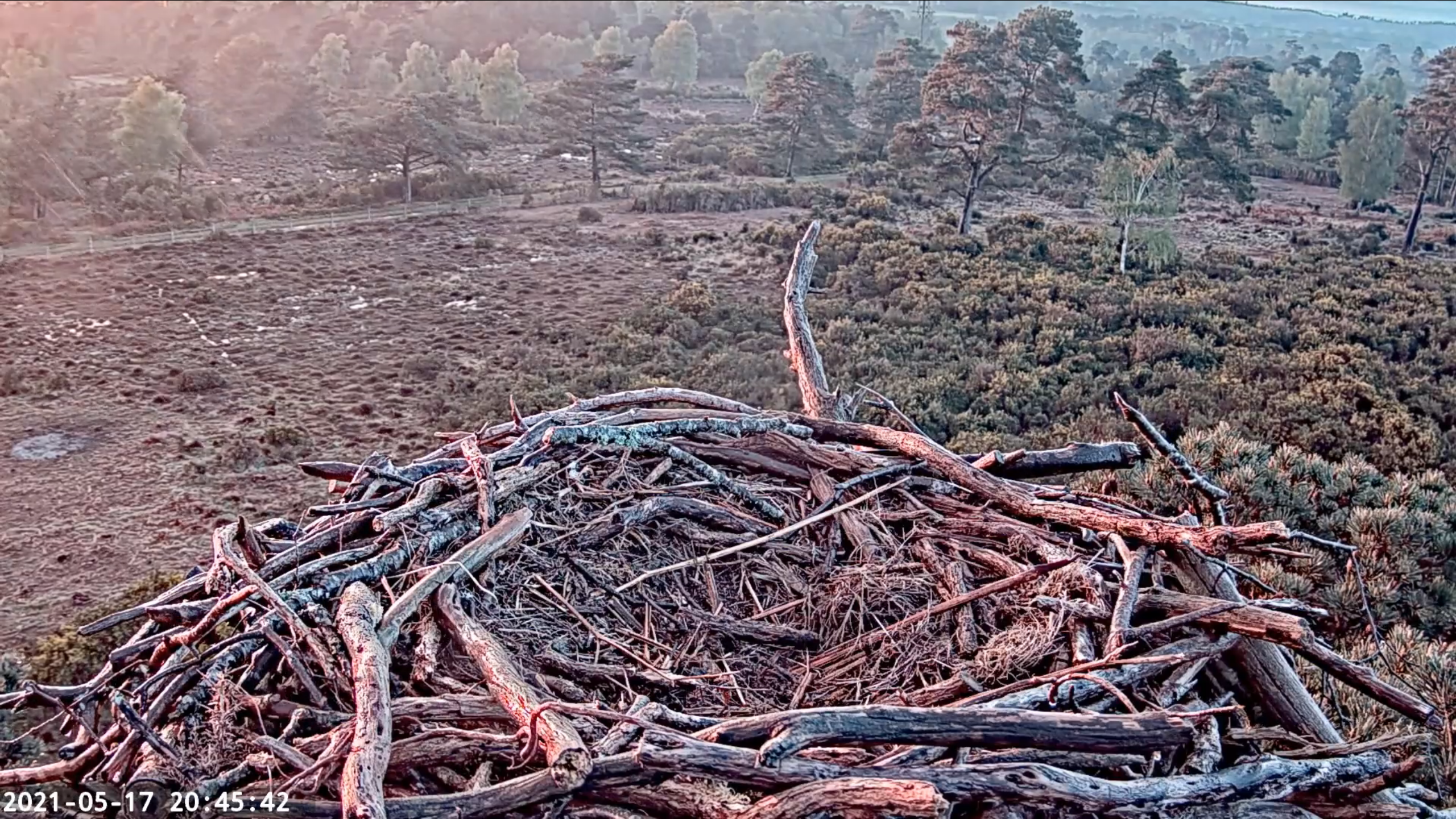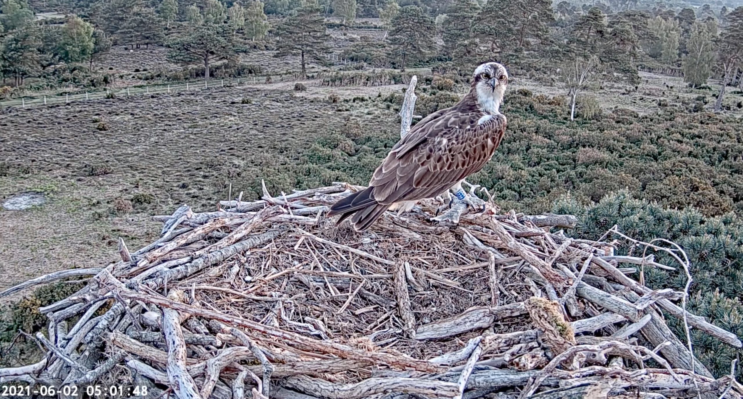 With the wind dying down, CJ7 spent the morning on one of the nest platforms today, though wasn’t reported to be seen any nest platforms during most of the afternoon. The unringed Osprey that was on the Middlebere nest yesterday was present again this morning, still seemingly working on a fish that was caught late yesterday! The same individual put in an appearance back on the nest later this afternoon, photographed by one of our motion-sensitive cameras.