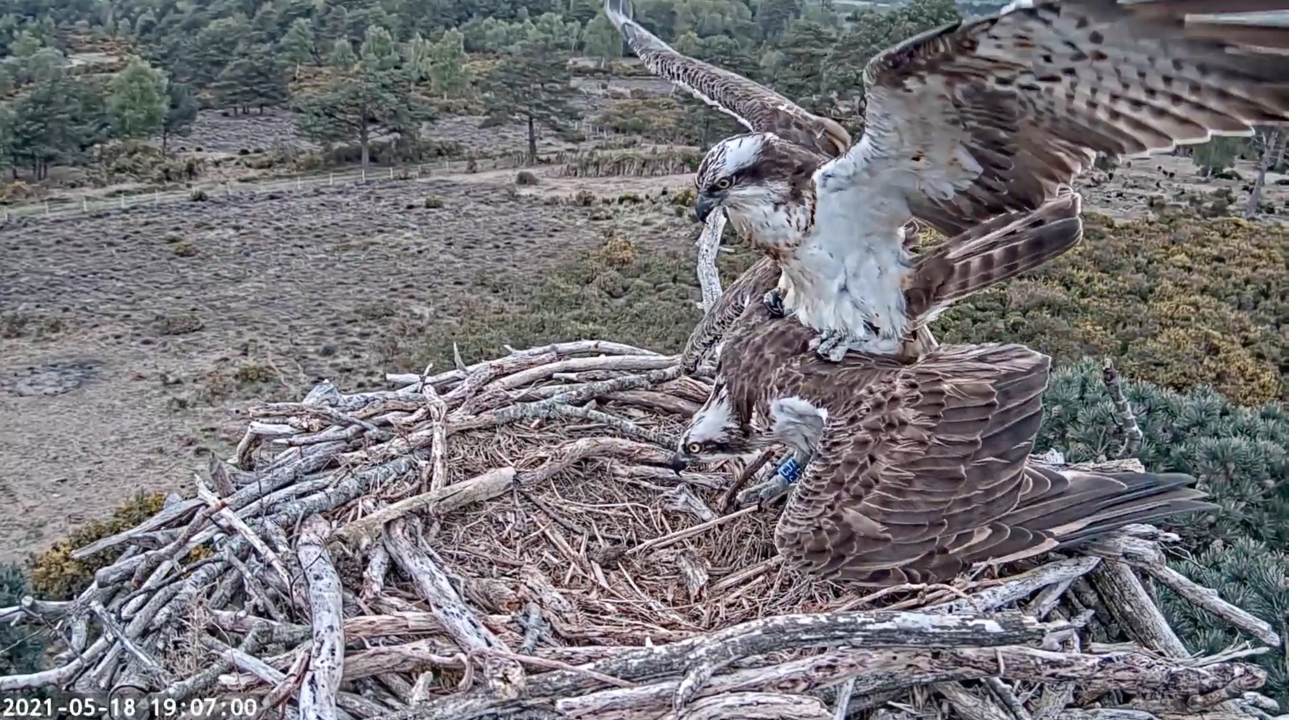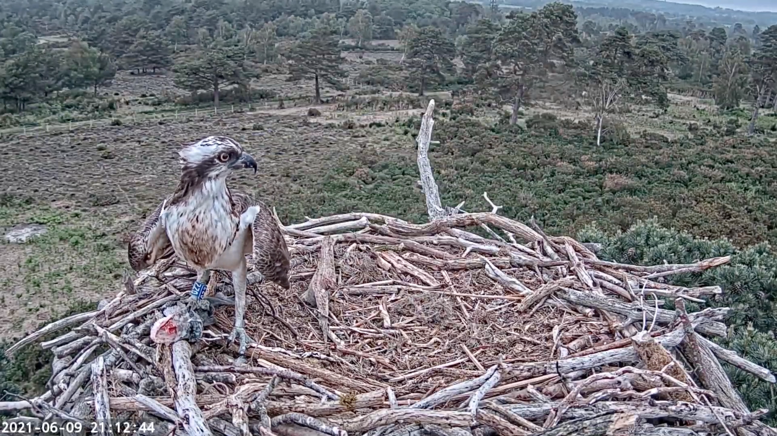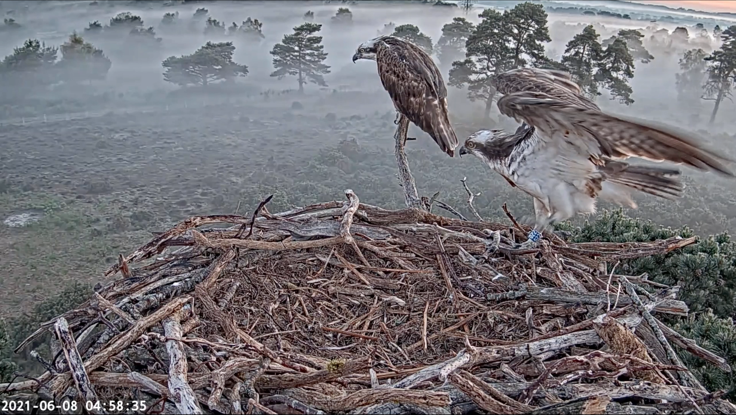 After a full night shift of incubating by CJ7, 022 seemed more than eager to take over early this morning. They carried on their recent pattern of frequent changeovers, though CJ7 rarely strayed far from the nest, often supervising from the adjacent branches. During early afternoon she seemed to grow tired of all this toing and froing, sitting firm in the nest each time 022 arrived. He eventually seemed to correctly interpret this as cue to go fetch some dinner, and returned with what looked like a Brown Trout at 5:20pm, which CJ7 quickly carried off.