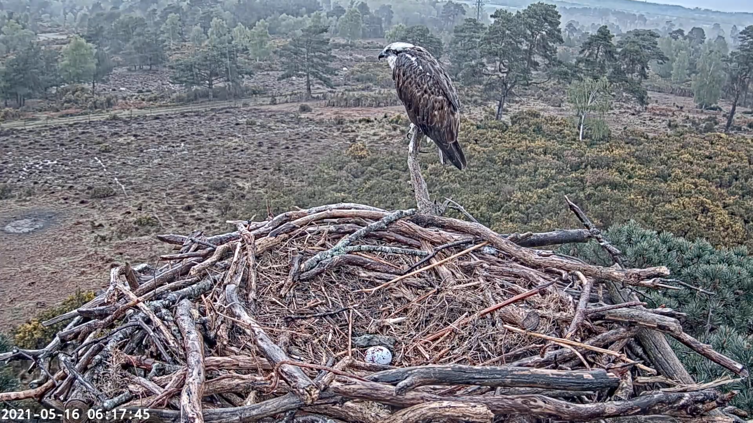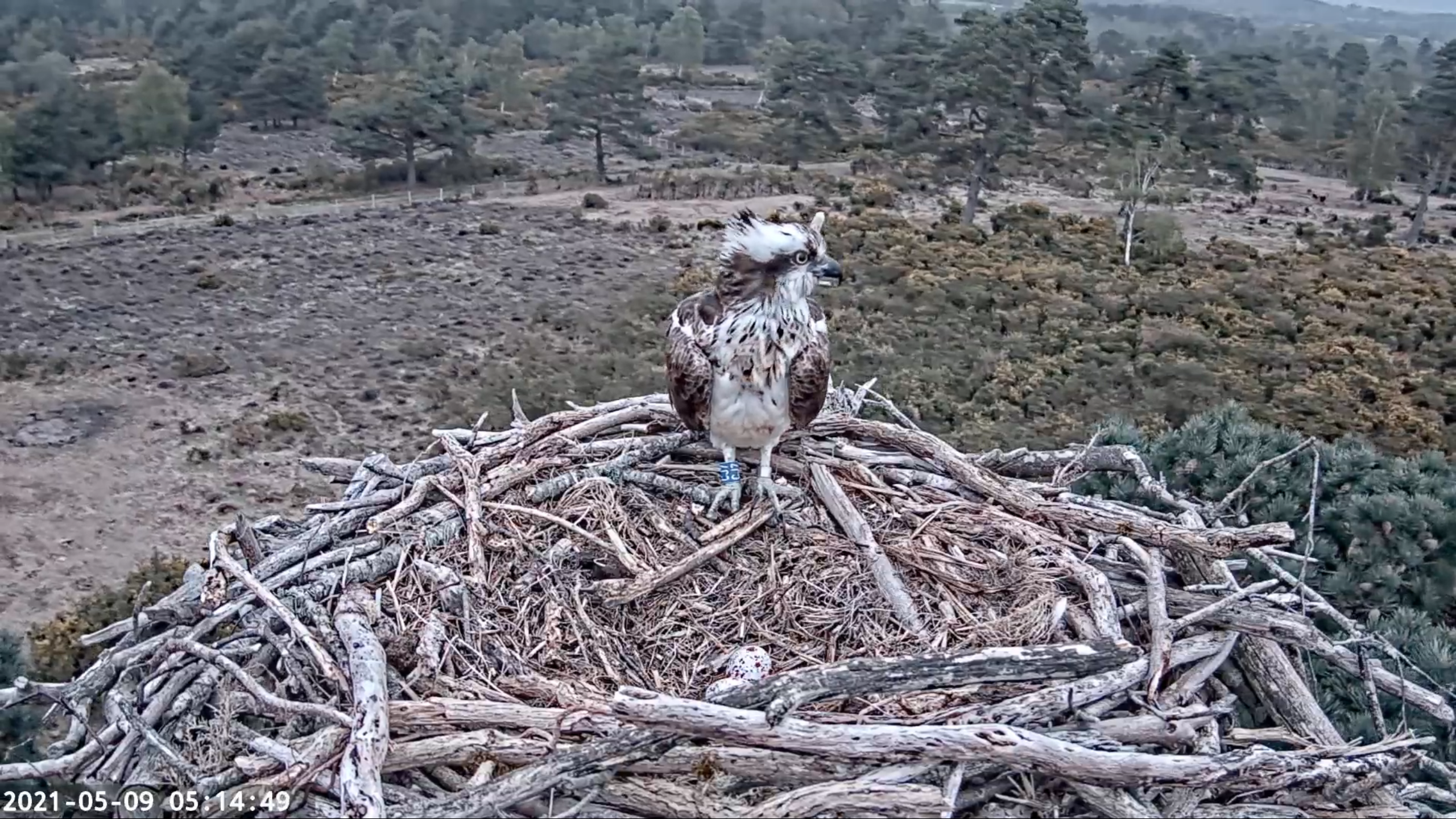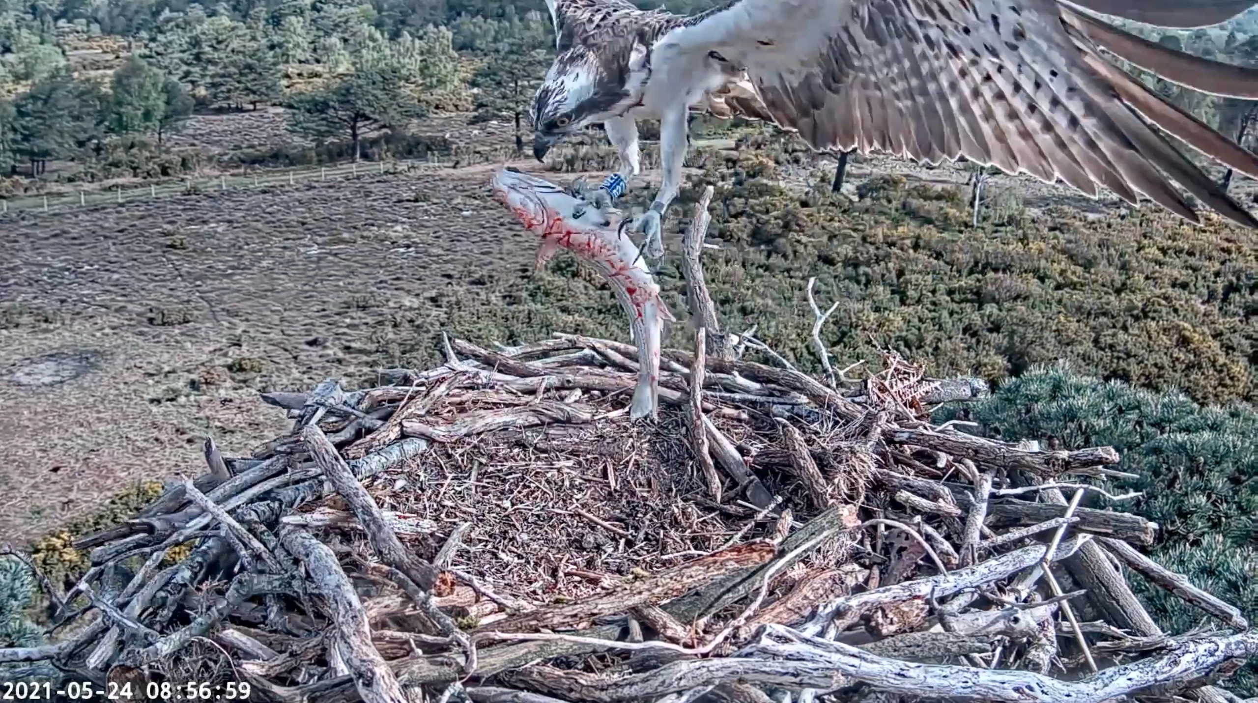After a full night shift of incubating by CJ7, 022 seemed more than eager to take over early this morning. They carried on their recent pattern of frequent changeovers, though CJ7 rarely strayed far from the nest, often supervising from the adjacent branches. During early afternoon she seemed to grow tired of all this toing and froing, sitting firm in the nest each time 022 arrived. He eventually seemed to correctly interpret this as cue to go fetch some dinner, and returned with what looked like a Brown Trout at 5:20pm, which CJ7 quickly carried off.