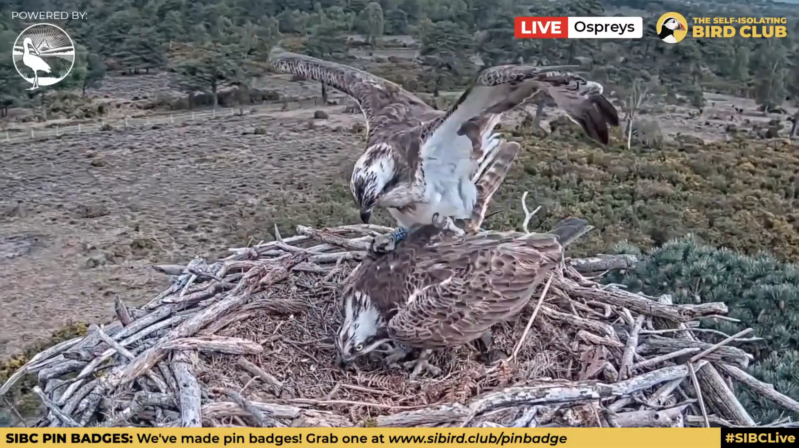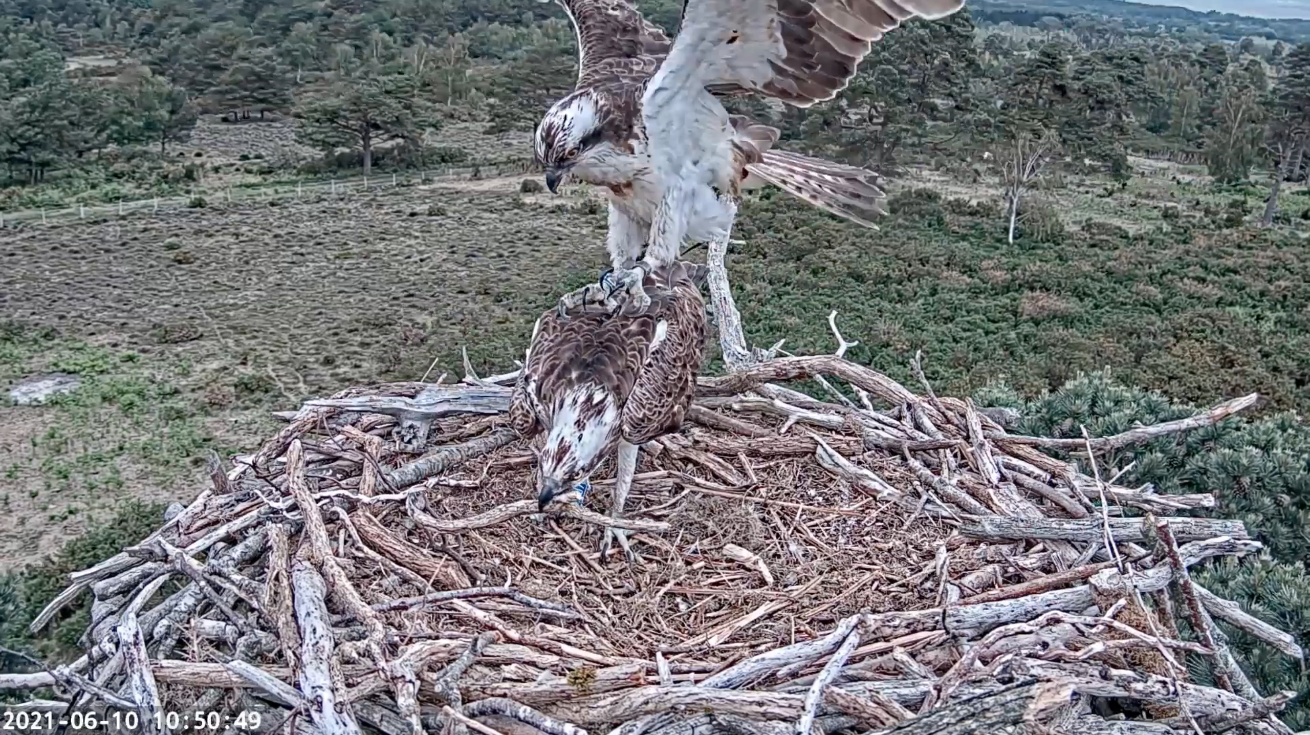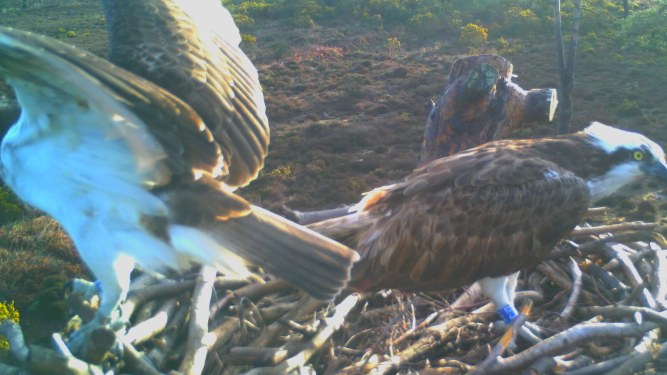 As many local people will be aware there was an illegal rave in East Lulworth overnight which could be heard all the way from the harbour! We like many people were concerned that the disturbance may negatively affect the local wildlife, including the ospreys. Fortunately however that seems not to have been the case: in fact we’ve seen a definite increase in the activity of both our pair around the nest, with lots of mating attempts and 022 taking a more active role in nest building. The only times he’s been away from the site have been to catch fish. There was an unfortunate incident this morning when he arrived with a small, still flapping fish, and during the hand over both birds let go! The fish quickly fell from the nest, leaving both birds looking down in bewilderment! Fortunately 022 went on to catch another three fish which they shared (fairly amicably) so no one went hungry. This is encouraging as we’re anticipating that a first egg may be laid in the next week or two, and want CJ7 to be in top condition.