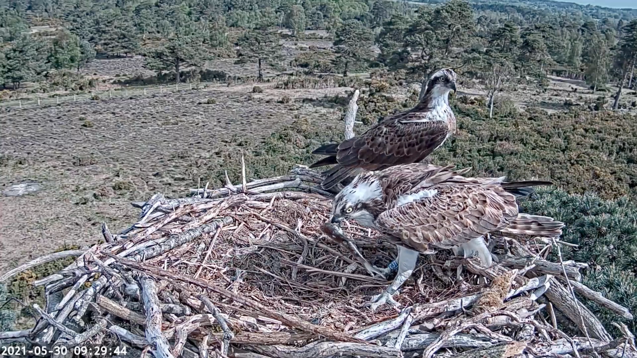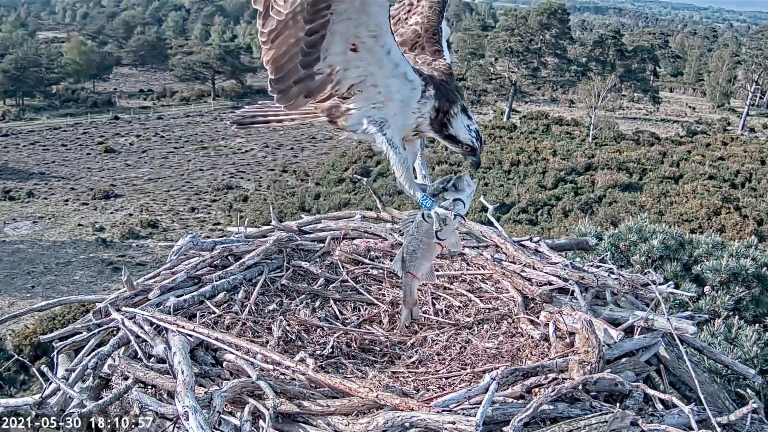Thank you all for your patience today whilst the new livestream camera was down. A power cut overnight had mean the internet connection had been lost. All back working again now at this new link! CJ7 and 022 continued their daily activities of nest building, mating and feeding. We weren’t short of opportunities to watch ospreys though, as the recent un-ringed female was perched on the Middlebere nest almost all day today, giving excellent views to visitors to Coombe Heath at RSPB Arne. She left on two occasions, both times returning with an enormous mullet which she ate in situ. She must be crossing paths with 022 on some of these hunting trips, so we wonder whether his presence might affect how long she stays.