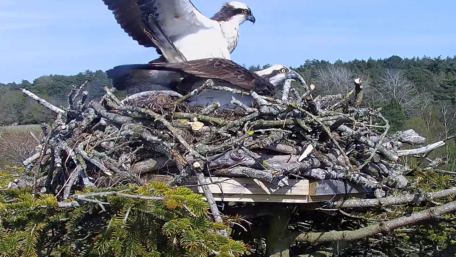 The activity on the nest has continued today, with further mating attempts from CJ7 and 022 on the new livestream nest. 022 has brought at least 2 fish to the site today, offering a share to CJ7 and continuing their bonding. He was active on the nest this morning, even doing some egg-cup scraping at around 06:41am. Elsewhere, an unringed Osprey was seen in Lytchett Bay today, and the large female that’s been seen recently on the Middlebere nest was present again this morning, with a huge fish in tow (likely a Mullet?).