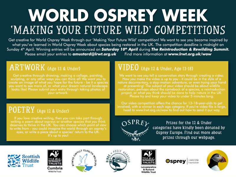 Each group is also reaching out to local schools, who we hope will be able to use the content as part of their school day. If you know of a school that would be interested in participating in World Osprey Week, please get in touch with us at bophhq@birdsofpooleharbour and amustard@lrwt.org.uk! Please note that most of the WOW content will be aimed at children of a primary school age, though anyone is welcome to get involved.