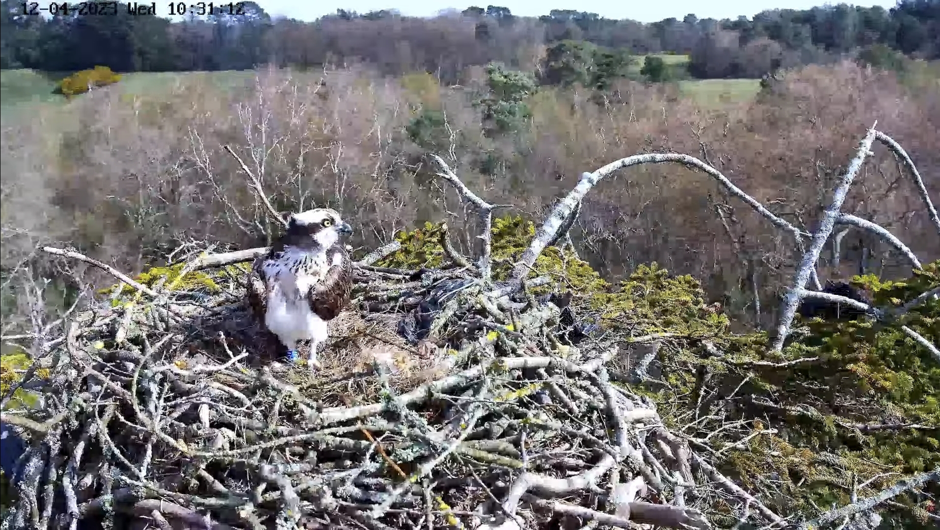 Since their return, our Osprey pair have both been busy adding material to their nest in preparation for breeding. This has included a variety of natural objects including moss and grass to line the nest cup and sticks to build up the nest wall. However on Friday 7th April our male 022 brought in a far less desirable lining material: a sheet of black plastic. Over the course of the bank holiday weekend he brought in several more pieces, some of which have since blow away (a preferable outcome for the Ospreys but not for the habitats they will have blown into), though the original piece remains weighed down by added later sticks.