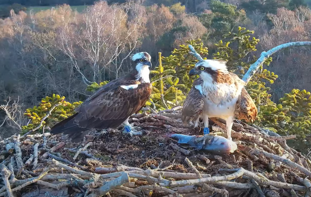 The female CJ7 arrived back last night at 6:29pm on 25th March and the male 022 arrived back this morning at 6:40am. This is the famous pair from our live webcameras that have raised an incredible 4 chicks for the last two years running. Hopefully, with their return, they will reaffirm their pair bond in the coming days, start building up their nest and eventually begin nesting.