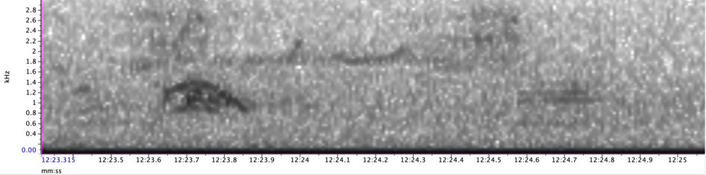 With the low mist over the weekend it seemed inevitable that a pea soup fog would roll in at some point, and it certainly did this morning. It didn’t take too long to burn off, and when it did it revealed a few surprises, not least a Snow Bunting found at the Lytchett Bay feeding station feeding with Greenfinches and Chaffinches this afternoon. An incredibly good, if not rather random find for a species that prefers rugged, coastal habitats during the winter, rather than woodlands next to a sewage works on the edge of town! The Forster’s Tern was still showing off in Poole Park all day, still attracting decent crowds and the Little Gull was still in Lytchett Fields. Around Sandbanks a Black-throated Diver was off Shore Road Beach, a Purple Sandpiper was on groyns  along from the Haven Hotel, a Red-necked Grebe was reported in Studland Bay with Black-necked Grebe and the 10 Glossy Ibis were on Wareham Common. Tonight a dusk watch/listen produced a good total of c60 Sand Martin and the first Little Ringed Plover of the Spring, also 2 Spoonbill, c60 Cattle Egret,Great White Egret and 2 Marsh Harrier. Plus, a Bittern left in near total darkness at 18:43 which was heard but not seen as it seemed to have tracked quite far north before it was heard calling as it left. We set up a static recorder just in case any Bittern decided to leave and managed to just about get seven calls as it flew off into the darkness, but it was already quite far off before it started calling, so we’ve stated the seconds within the recording that you can hear the bird call: Bittern calls can be heard at 3, 8, 11, 18, 28, 38 and 46 seconds. Bittern calls sit at a very low frequency with the peak of the call only reaching 1.4kHz as highlight on the sonagram below.