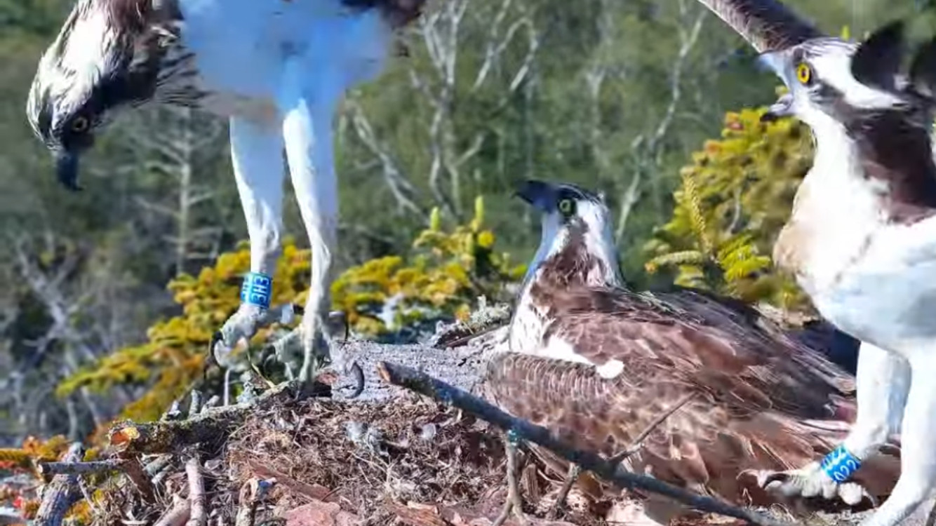 The first 2-year old Osprey of the season appeared on the Careys Nest today, sadly not one of ours, but in fact yet another Rutland female from the 2023 Manton Bay nest ‘3H3’ !!