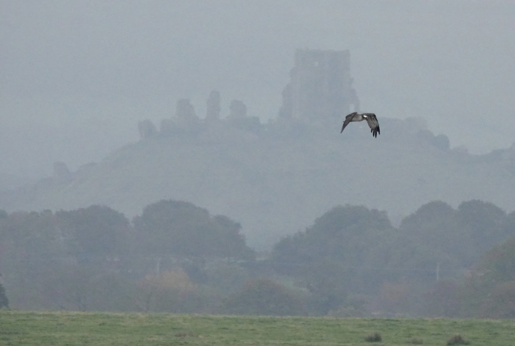 Another really grey day with the sun apparently not due to re-appear for several days yet. So we start November in a typically grey, wintery manner. What wasn’t so typical though was the setting of mist and murk surrounding Corfe Castle with an Osprey flying past, which was a scene captured perfectly by local photographer Alison Copland. There were 2 Black-necked Grebe in the harbour mouth this morning, and this evening the ‘Harrier Watchers’ logged 14 Marsh Harrier entering the west harbour roost. At Swineham 2 Ruff were still on the Stilt Pools, plus 35 Cattle Egret and 1 Great White Egret. The lone Golden Plover was seen again over Swineham with the Lapwing flock.