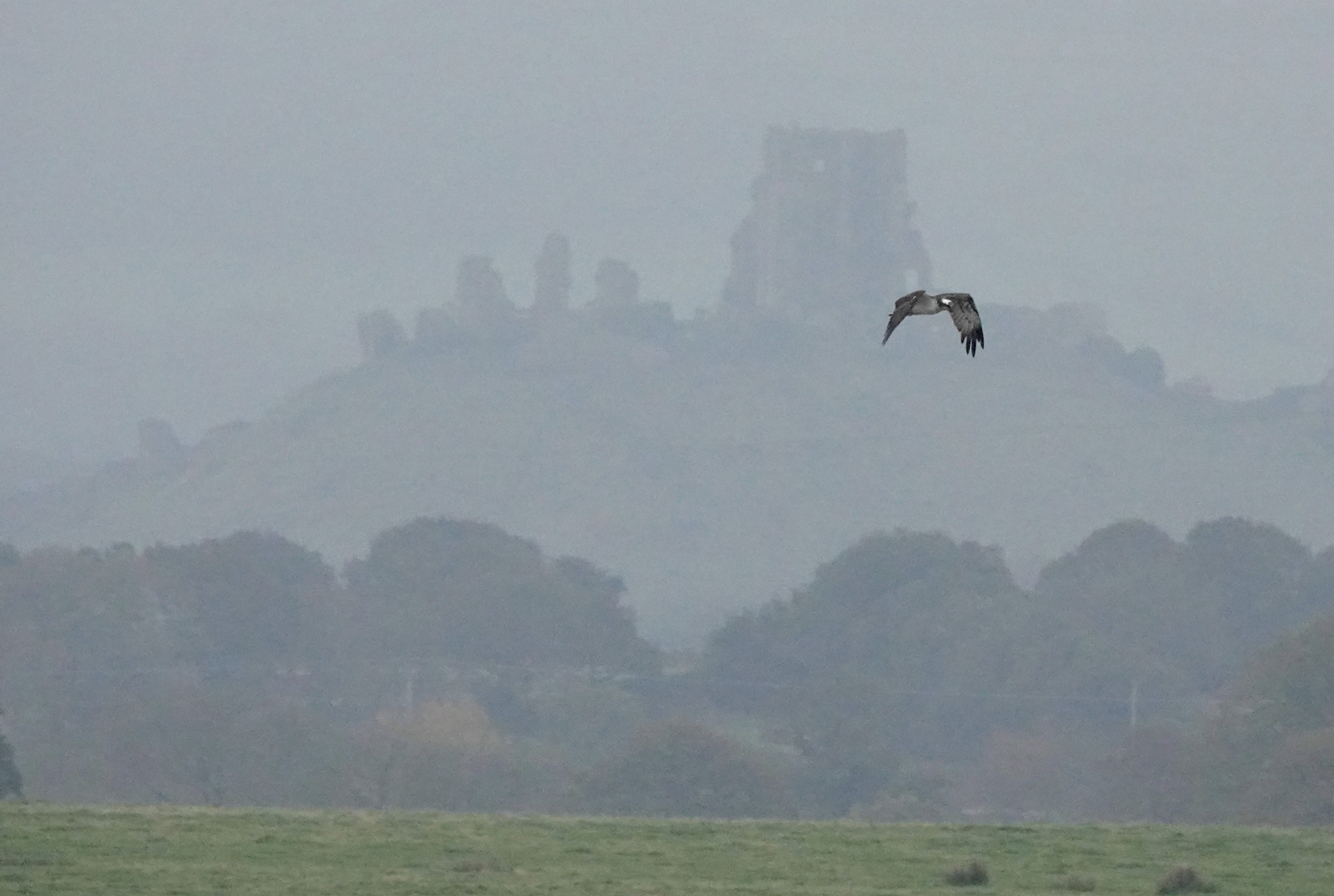 Osprey flying past a wintery Corfe Castle – Middlebere – Alison Copland