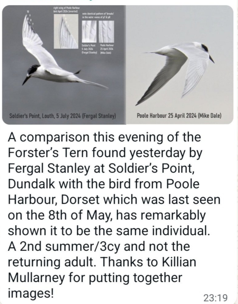 We were made aware of some interesting news today, that the Forster’s Tern which frequented the harbour back in the spring, and what was considered to be the same individual as last year has recently been re-found in NE Ireland at Soldiers Point, Dundalk. This confirmation was made by bird ID expert Killian Mullarney, who lives in Ireland by comparing photos of when the bird was with us in April and photos that were taken yesterday in Dundalk. This is a remarkable piece of identification, but lets hope it ventures it’s way south again soon, just like it did last year. Interestingly, in a strange twist of this story, a/the Forster’s Tern was reported off Shipstal Beach this evening, although the sighting wasn’t confirmed.