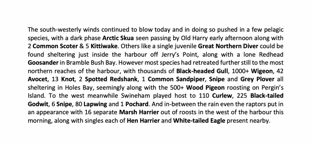 There was also a Hen Harrier in Brands Bay, 1 Water Pipit at the Rock Lea screen, a Barn Owl in the Lytchett Fields approach fields, 1 Red-throated Diver past Shell Bay and 2 Merlin on Hartland.