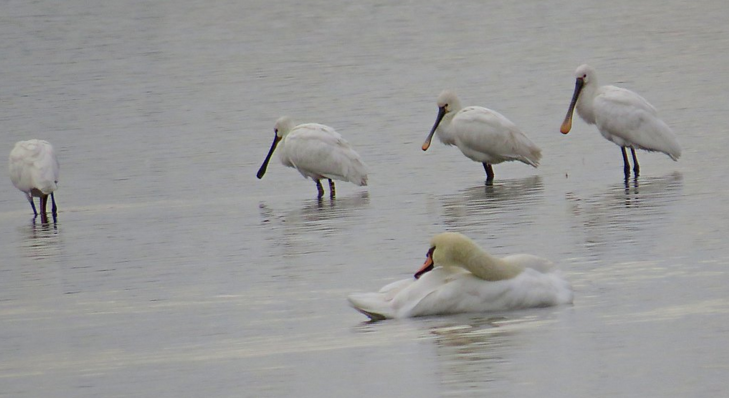 Again, today the conditions proved excellent watching conditions out in the harbour as wind fell silent and grey sky offered “squintless” viewing opportunities. There was a good variety of species out in central harbour, viewed from Hamworthy Beach which included 1 Scaup off Arne, 1 Eider off Green Island, 1 Great White Egret feeding on the beach at Shipstal, 9 Common Scoter out in central harbour with the first 11 Goldeneye of the winter, 48 Red-breasted Merganser, 54 Great Crested Grebe and 2 Spoonbill were feeding on the southern shores of Rempstone. There was no question as to the birds of the day as 4 Common Crane flew over Ower on the Rempstone Estate along the southern shores which unfortunately didn’t stay long and ended up over at the Fleet, Portland by early afternoon. In Holes Bay NE a handful of birders were eagerly awaiting the arrival of some Spoonbill with the rising tide, and they were rewarded with 4 coming in to feed around 10am with 85 Avocet, 500+ Wigeon, 2 Pintail and good numbers of common wader species. There was another Spoonbill on the Upton CP side of Holes Bay too. Out off Middle Beach, Studland, there were 23 Black-necked Grebe feeding.