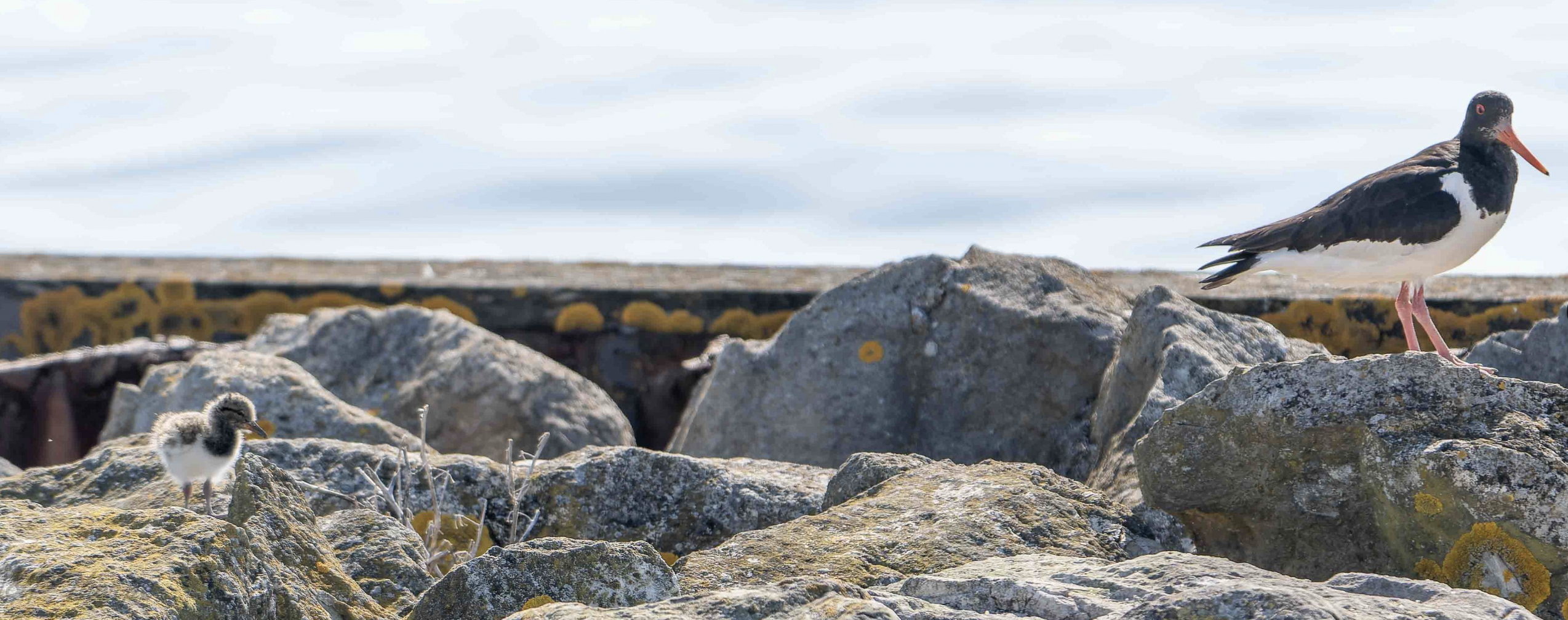Adult Oystercatcher and newly hatched chick – Poole Quay – John Thorpe