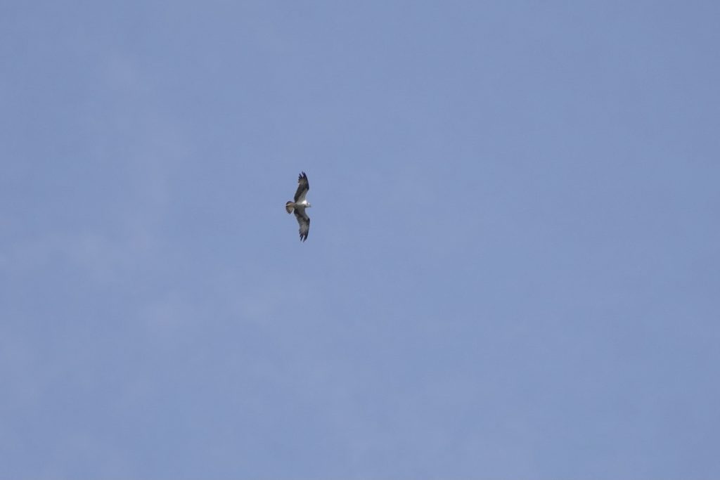 The Osprey action at Arne picked up again this morning, with 2 birds flying with each other over Hyde’s Heath. From photographs, it appears that one of the individuals was 022, identifiable due to his wing moult. Due to the nature of their behaviour, with one of the birds calling, it may be that the other bird was the newcomer that appeared on Wednesday. Otherwise, CJ7 and 022 have continued their usual behaviour, with 022 bringing in a bass for CJ7 shortly before midday.