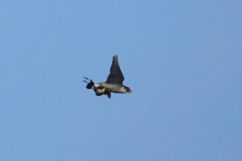 Peregrine with Black-tailed Godwit prey over Poole Quay yesterday – David Turner