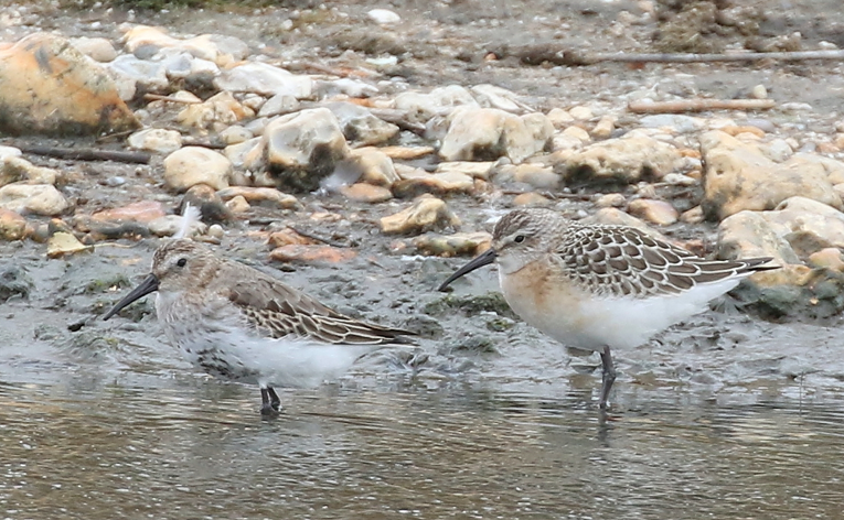 Dunlin (left) Curlew Sandpiper (right) – Brownsea Lagoon – Peter Moore