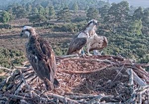 Secondly, there was excitement of a different kind this evening when a ‘new’ Osprey suddenly appeared on the Osprey nest cam. A quick glance of the camera showed an Osprey sat preening but with a blue ring on the left leg….a Scottich Osprey! With the HD camera quality allowing us to read the ring number as PT0, a quick chat with our project partner Tim Mackrill from the Roy Dennis Wildlife Foundation highlighted that this particular bird was a 2018 bird from the Loch of the Lowes nest. But, the big question was is it male or female. The ringing data at the time stated this bird was a male, but discussions later in the 2018 season suggested that perhaps it was in fact a female based on size. Fast forward to this evening and PT0 really showed an interest in the nest and CJ7 but CJ7 seemed less than impressed and chased PT0 off several times. At no point did they sit on the nest together and it all seemed a bit fractured, which would support the theory PT0 is in fact a female. Also, the breast band and similar size to CJ7 would also support this.