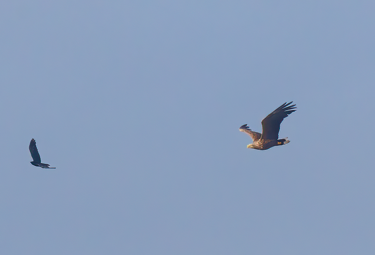 White-tailed Eagle G463 in hot pursuit of a crow from this morning’s Autumn Safari Cruise – Wareham Channel – Harry McBride