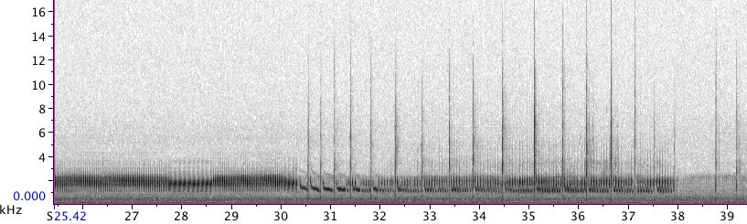 The recording below is of a male Nightjar on Hartland Moor last night. On heathland all over Dorset Nightjar are becoming really active as they start to defend their territories and try to attract a mate. This bird was one of 8 vigorously flying about calling and churring. At the end of the recording you’ll hear the strange bubbling sound and numerous wing claps that the bird makes as it leaves its churring post, a sound seldom heard unless close to the bird. The sonagram shows the moment the Nightjar stops churring and starts wing clapping, with the sharp spike in the graph depicting each wing clap.