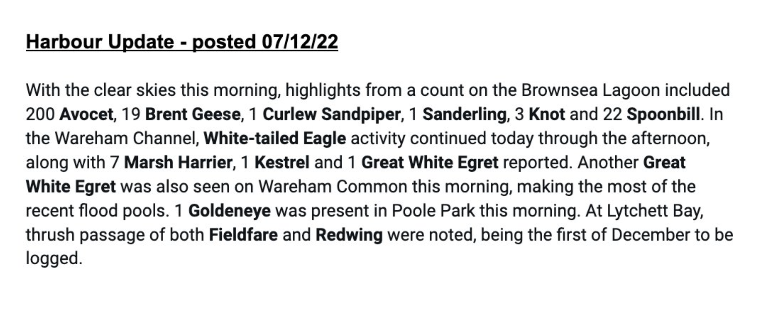 Beautifully still, clear skies and frost-cover ground made for promising birding conditions if you were prepared to brave the sub-zero temperatures (some areas around the harbour reached a biting -8°C just before dawn!). The cold start saw 21 Marsh Harriers leave the Poole Harbour roosts this morning, joined by a fly by ringtail Hen Harrier shortly before a Red Kite drifted towards Brownsea from Studland and the new Rock Lea Viewpoint enjoyed action from 3 Marsh Harriers, Merlin and Sparrowhawk. The Wareham Common Great White Egret was present again, in search of suitable feeding grounds beyond the frozen floods. The Black Brant was photographed among the dark-bellied Brent Goose flock in the Middlebere Channel and plummeting temperatures during a Studland visit at sunset produced singles of Great Northern Diver, 5 Black-necked Grebe and 1 Slavonian Grebe, as well as a minimum count of 9 Black-necked Grebe and 4 Ring-necked Parakeets all from Middle Beach. Moving to Jerry’s Point at dusk offered a further 2 Great Northern Diver, a Red-throated Diver, 28 Great Crested Grebe and a decent variety of waders at the Houseboats logging 20+ Sanderling, 20+ Turnstone, 32 Ringed Plover with 4 Grey Plover.