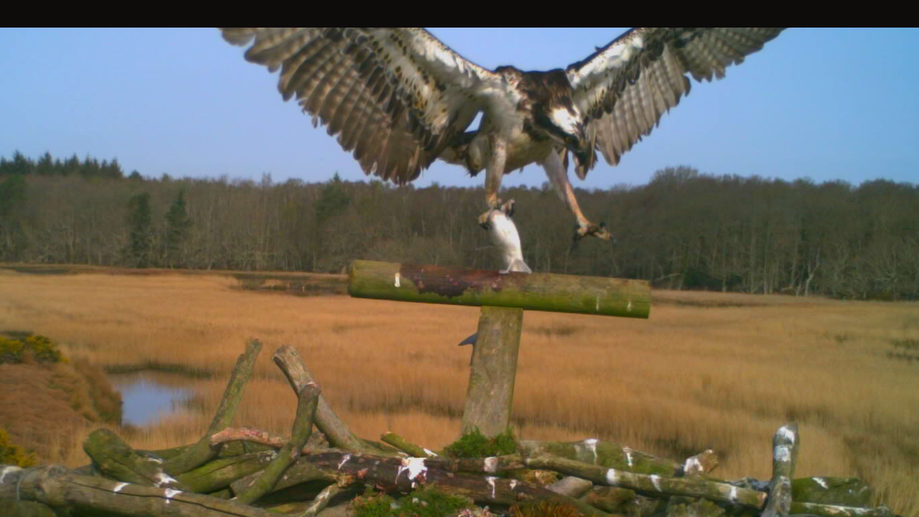 Female Osprey ‘Beaky’ taking yet another fish to Middlebere platform