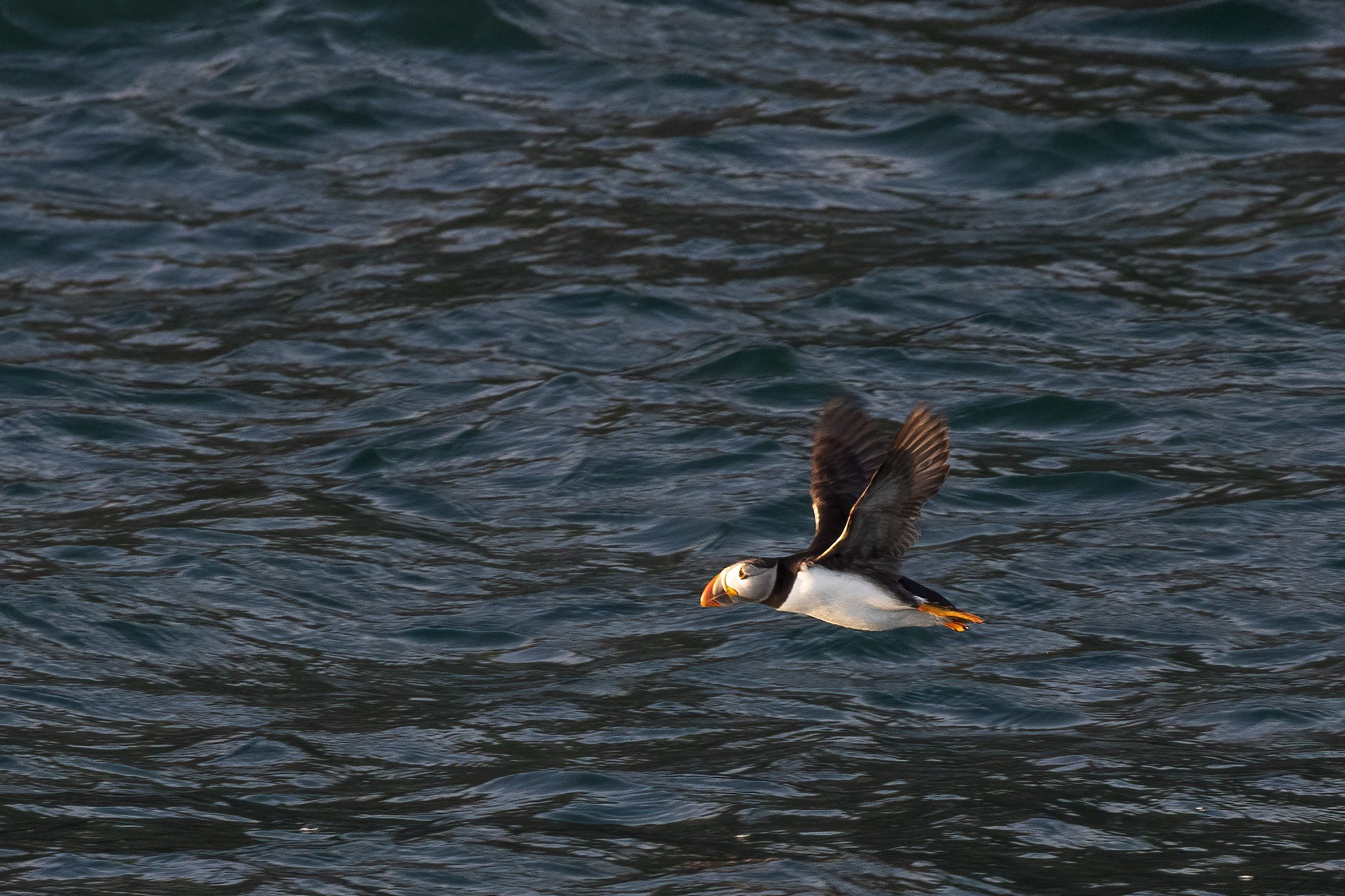 Puffin in flight from Purbeck Puffin Cruise – Clare Slade