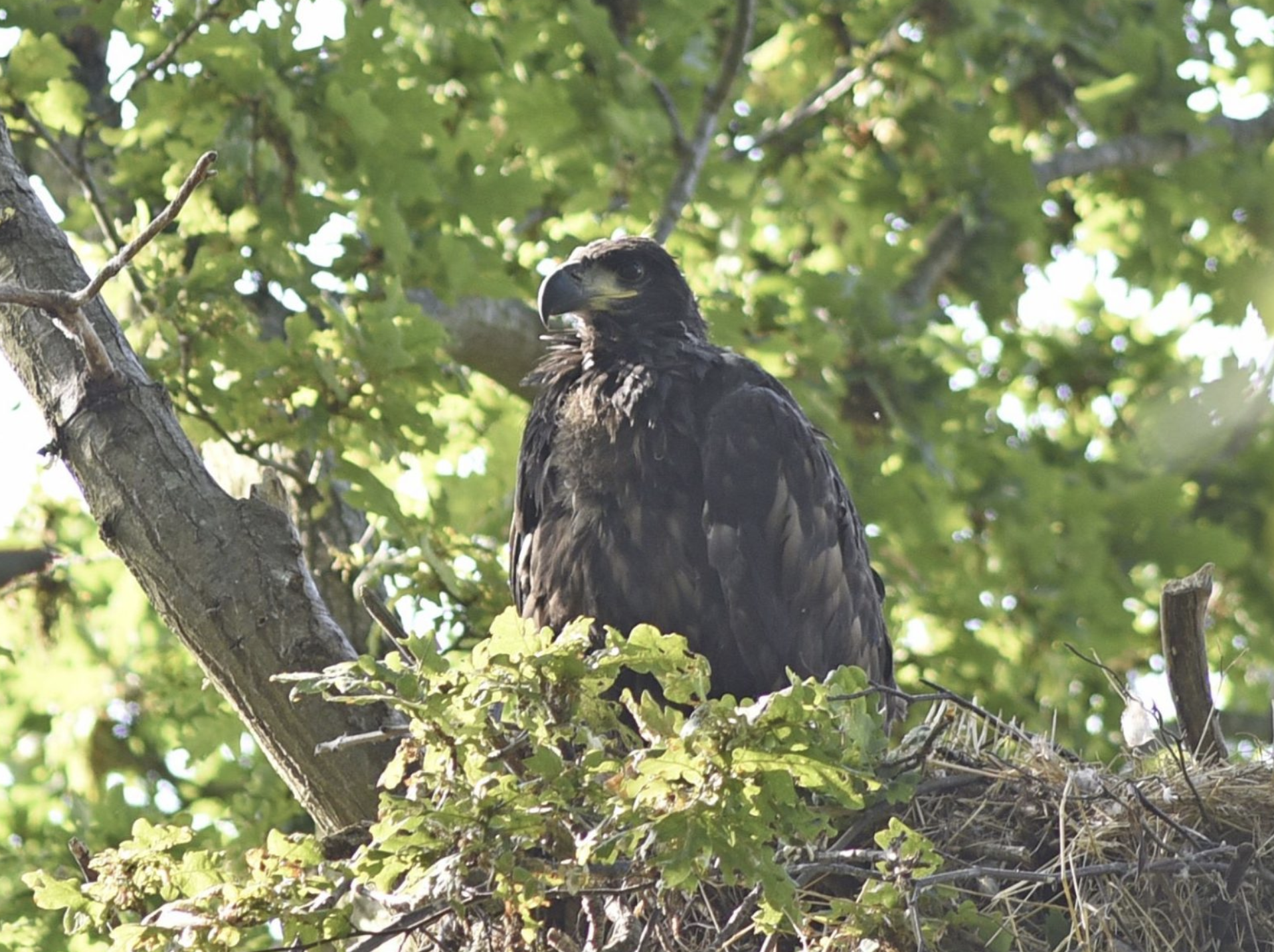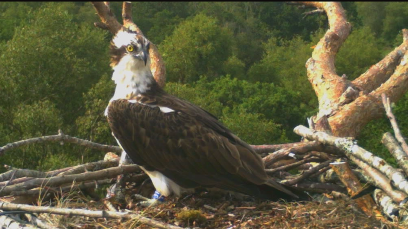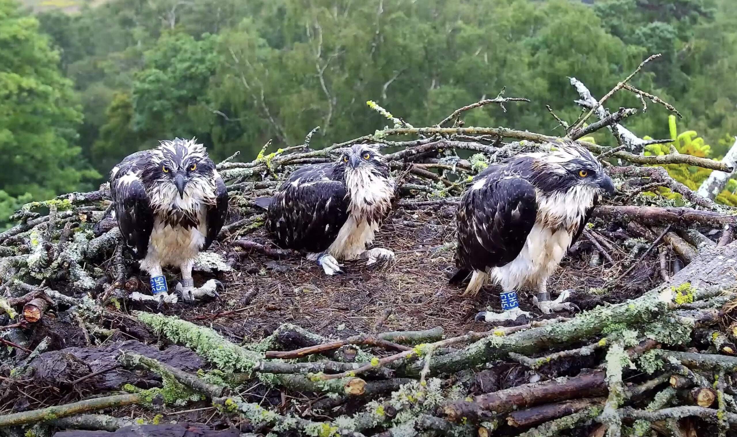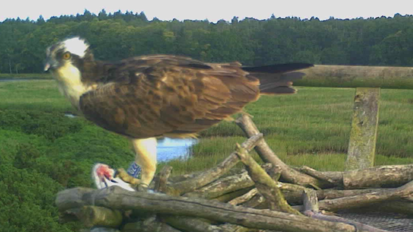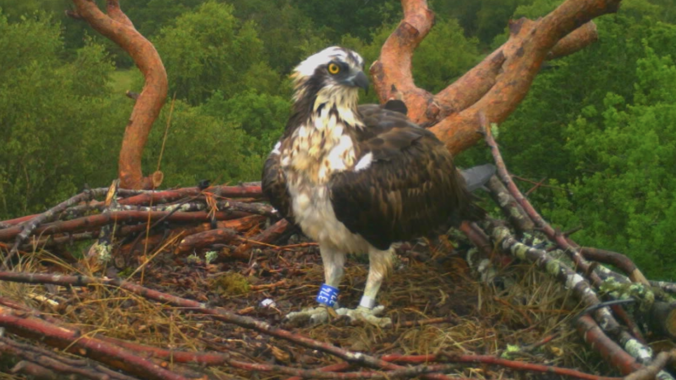 Finally, we saw the first fledging of the season from one of our Osprey chicks, with the youngest ‘5H3’ being the surprise first youngster to take the leap. He did brilliantly flying around the nest before settling in nearby dead trees for 20 minutes before then expertly returning to the nest and crash landing on top of CJ7! The whole family were back on the nest this evening but no doubt the rest will give flying a go over the next few days. Perhaps we might see an empty nest by the end of the week?!