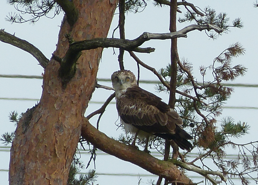 I really don’t know where to start other than wow! Just when you think things can’t get any better a MEGA appears in a tree right next to the group you’re taking out for a field trip. On todays ‘Birds of Poole Harbour’ guided walk at Morden Bog, something so incredible happened that I still can’t believe it actually happened. Our group had already been treated to great views of Dartford Warbler, Woodlark, Tree Pipit, Cuckoo, Stonechat along with flyover Crossbill, Siskin and lots of Mistle Thrush when a member of the group (Alan King) spotted a bird of prey sat in a tree further on the other side of the heath. Initially the views weren’t great but the bird was pale, chunky, had a pale eye and seemed Buzzard like. Having experienced and been fooled by many, many pale Buzzards, of which Dorset has plenty I instantly ID’d it an extremely pale morph Buzzard. As we got closer it soon started to become clear that this wasn’t a Common Buzzard, so what was it? A Honey Buzzard was my next logical thought but the head was way too small and tail too short. Then a moment of total and utter madness occurred when the thought of Short-toed Eagle popped into my head, surely not? We opened the Collins Filed Guide and there it was, our bird, the same bird that had been sat in the tree. Almost wanting to faint, we gathered as many photos as we could to help confirm the ID and started breaking the news. What an absolutely AMAZING bird, made even more special by the fact it then returned later in the day for many many more birders to enjoy